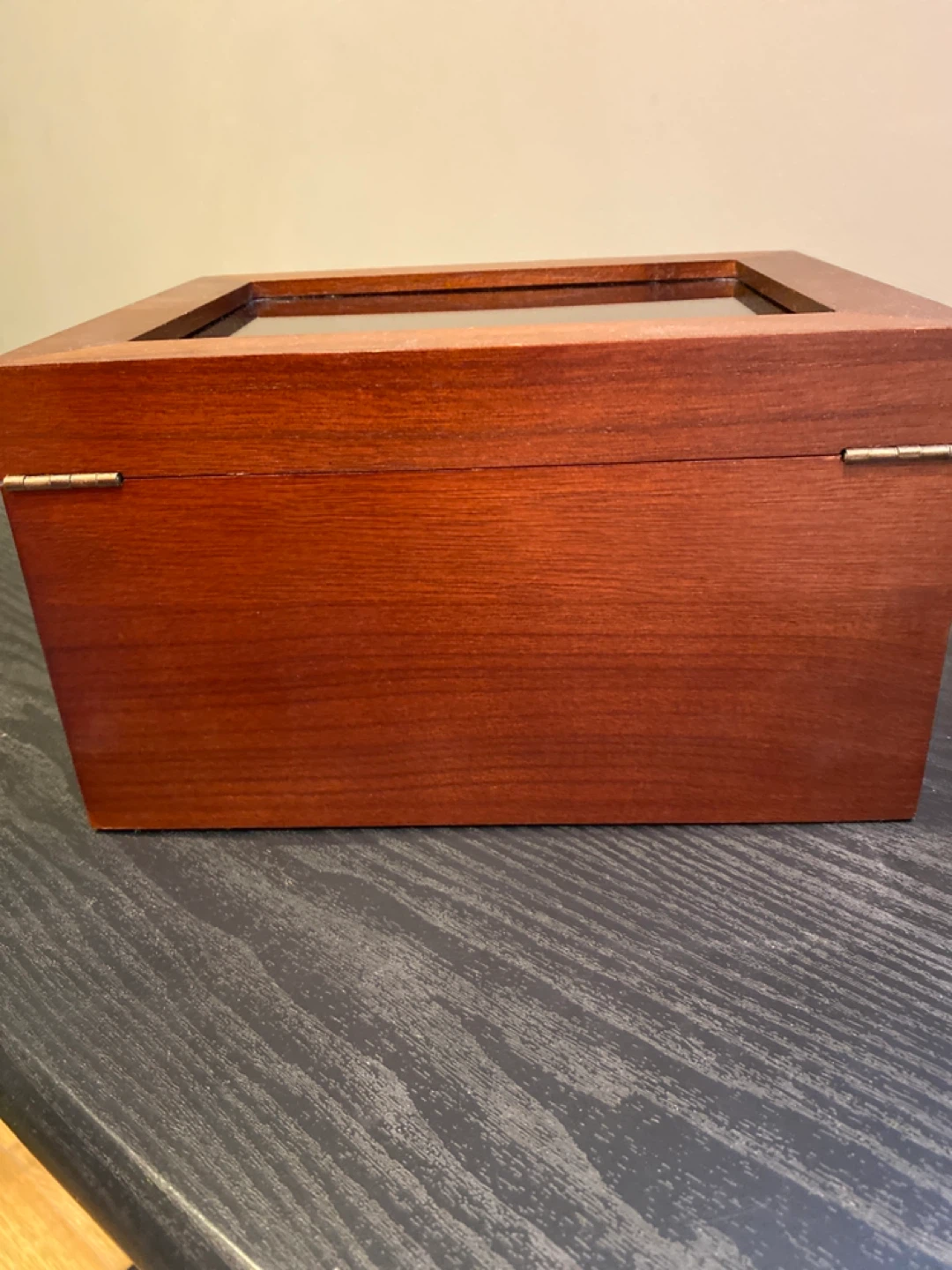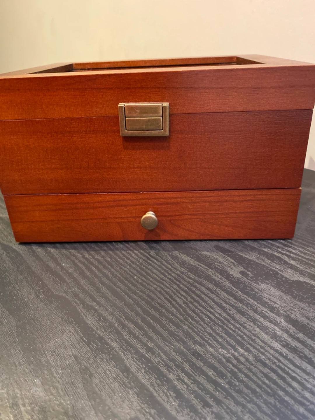 Selling a lovely wooden jewelry box! It features a glass top to display your favourite pieces and a drawer for extra storage.