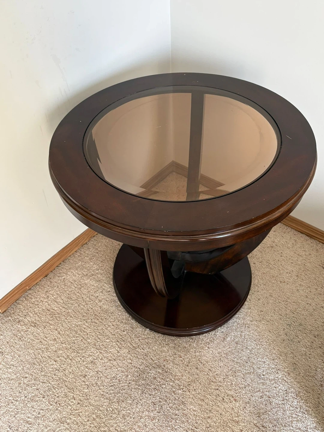 Selling a round coffee table with a dark wood finish and a glass top. It's in good condition and would be a great addition to any living room or seating area. The table features a unique pedestal base.