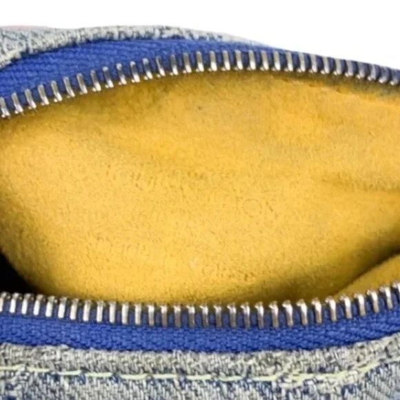 This Louis Vuitton Blue Denim Monogram Denim Mini Speedy Key and Bag Charm is perfect for holding small items and can attach to your keys or onto an LV d-ring. It features a barrel design with stonewashed denim, the LV pattern, and a metal push lock closure. The denim has faded and has wear throughout, particularly to the edges and corners. The leather trim has turned a medium patina and shows black wear marks. The gold-tone hardware has surface scratches. The interior had slight wear but overall is in very good condition. Code: TH1006. Gently worn, faded. Some tarnishing on the gold hardware. The buckle on the end of the keychain is a bit hard to open but still is functional. Selling as is. Size: 4.25x3x2". See last photos for scale.