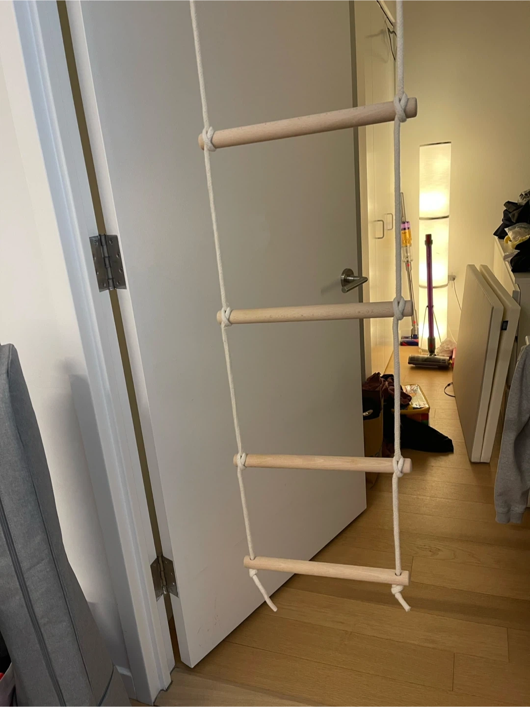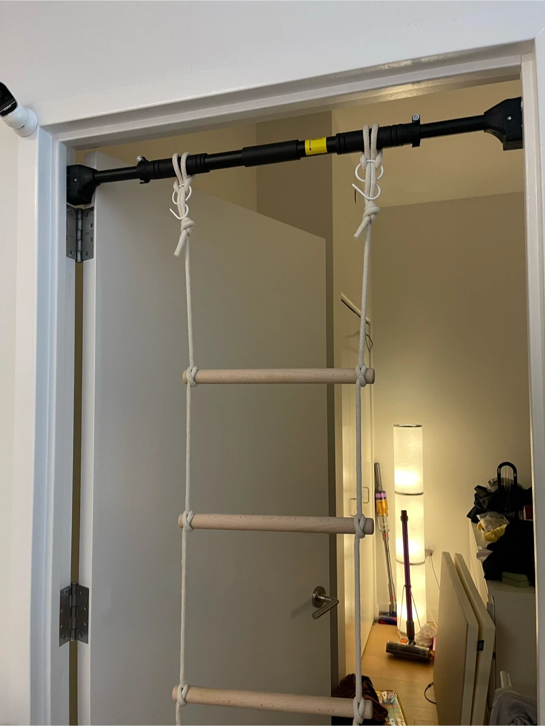 (Look at all pictures, Click on the picture you can see it in detail, The sizes are shown at the back.) Door frame Indoor door gym rope ladder, swing. Perfect for fun exercise at home. It's in good condition, so you can use it right away. Easy to install on your room door. It's a device that adults can exercise using a pull-up bar, and children can ride a swing or ladder. (Cash only) (You must come pick up your items. If you come to the apartment, I will take the goods to the lobby)