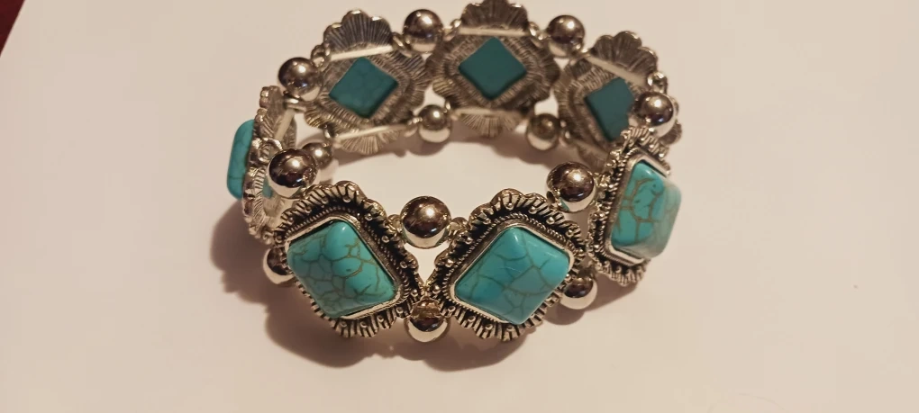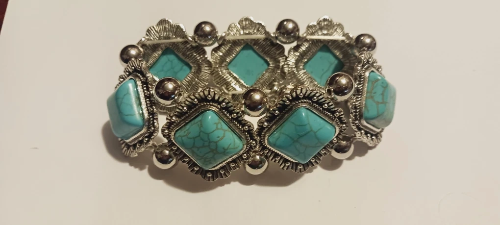 NEW !!This is a unique bracelet with turquoise stones set in a silver-tone metal. It's a stretch bracelet, making it easy to wear and comfortable on the wrist. The design features square stones with a crackle pattern, surrounded by decorative metalwork and small silver beads. A stylish statement piece!