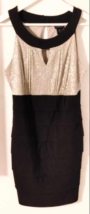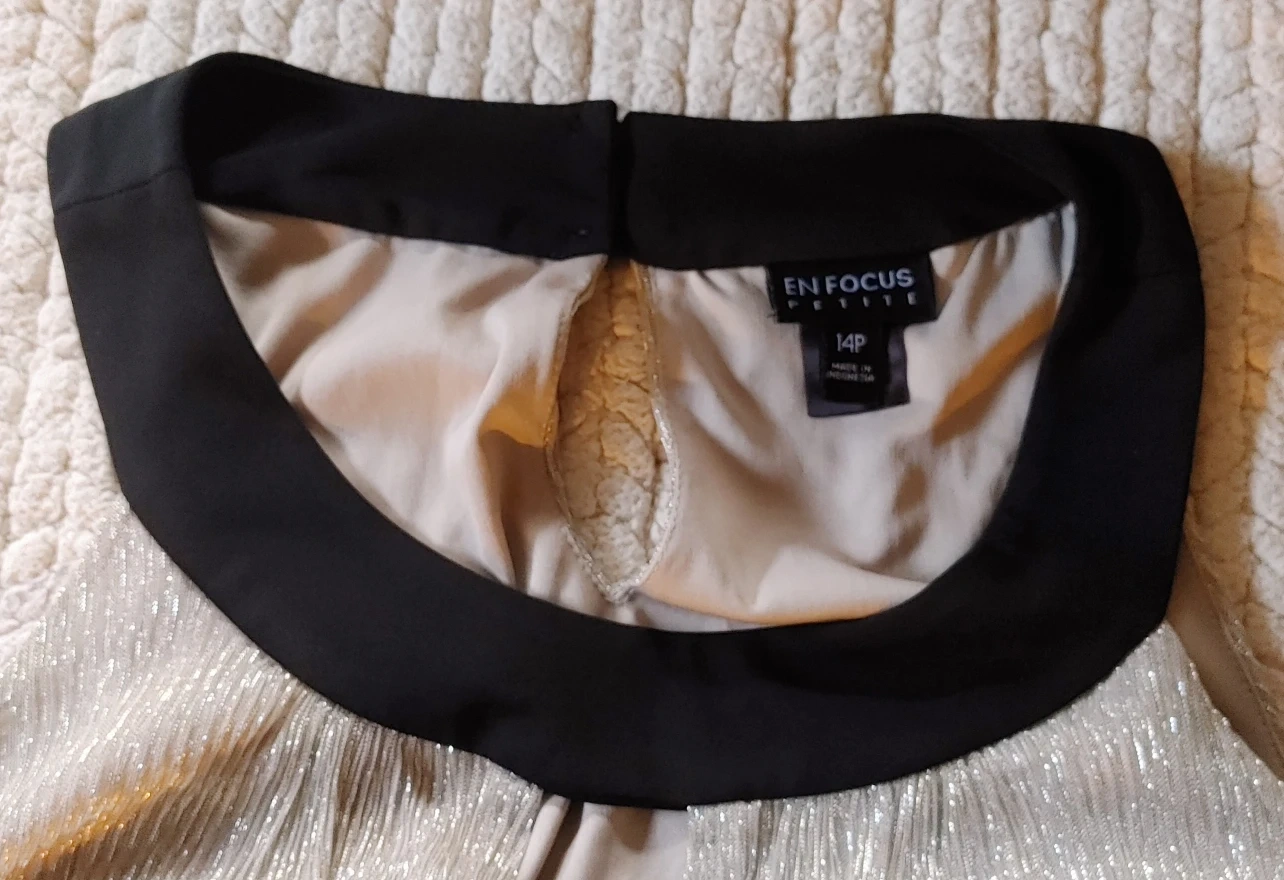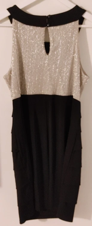 En Focus Petite cocktail dress. It's a size 14P and features a black and silver design woth a 2 button closure on back of the neck. Excellent condition. No rips, stains or fraying. Smoke free home pick up Mt Mt.Brydges cash only.