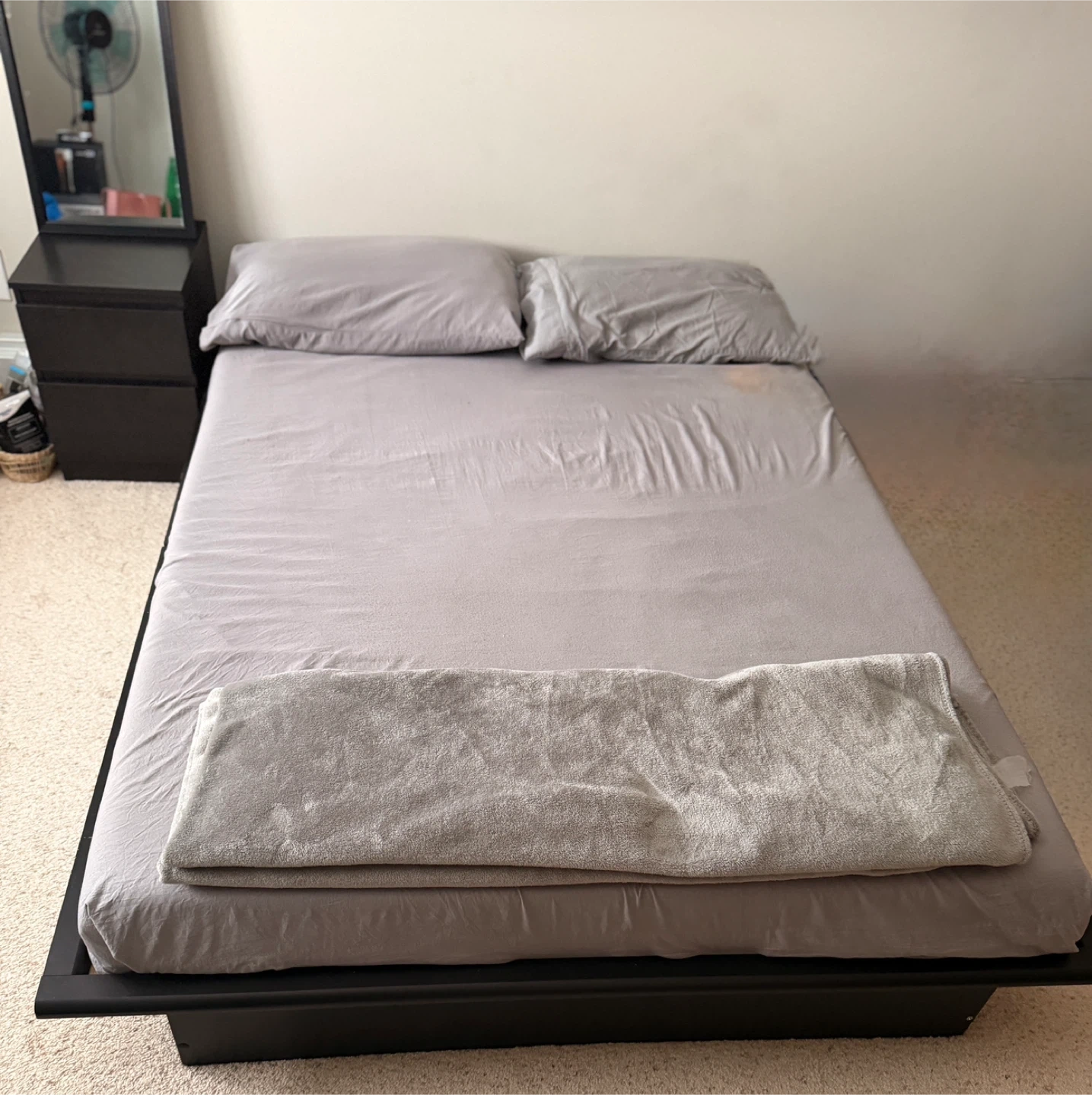 Selling a bed frame, mattress, and nightstand. The set is in good condition and ready for a new home
