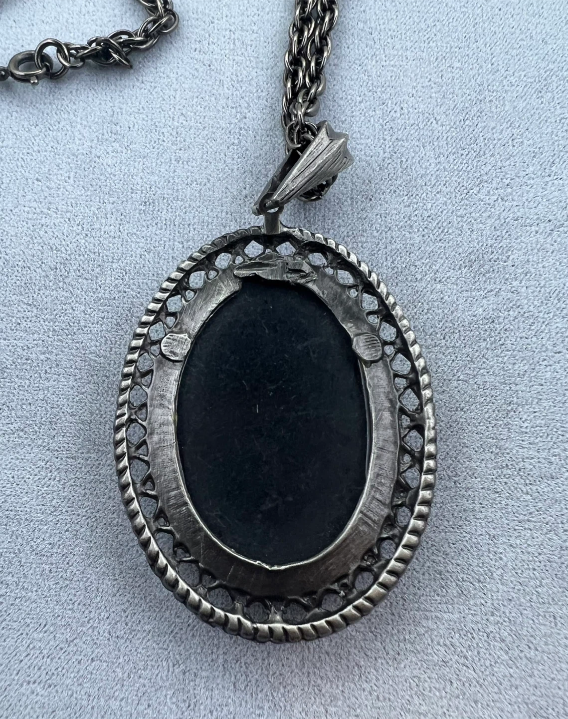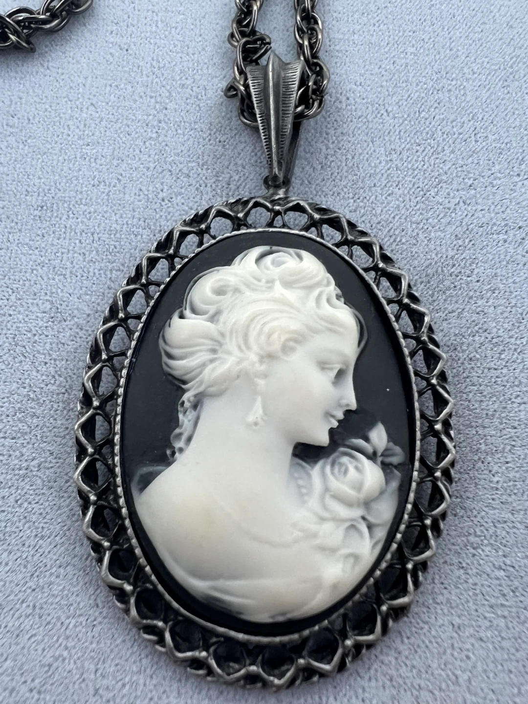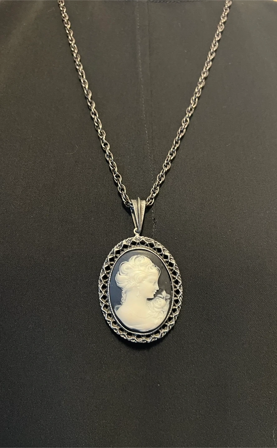 Detailed cameo pendant with a classic design attached to a long dark metal chain complementing the black and white of the cameo itself