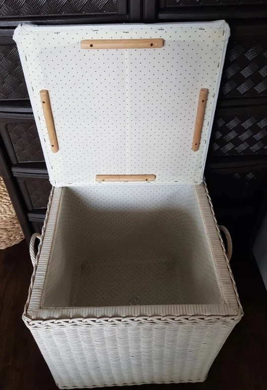 Here's a cream-coloured wicker storage ottoman! It's in great condition and perfect for adding some extra storage and seating to your home. The top is cushioned for comfort, and the inside is lined with a cute polka dot fabric