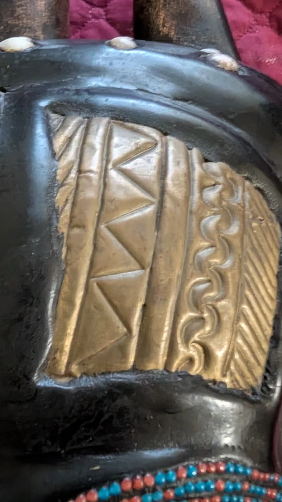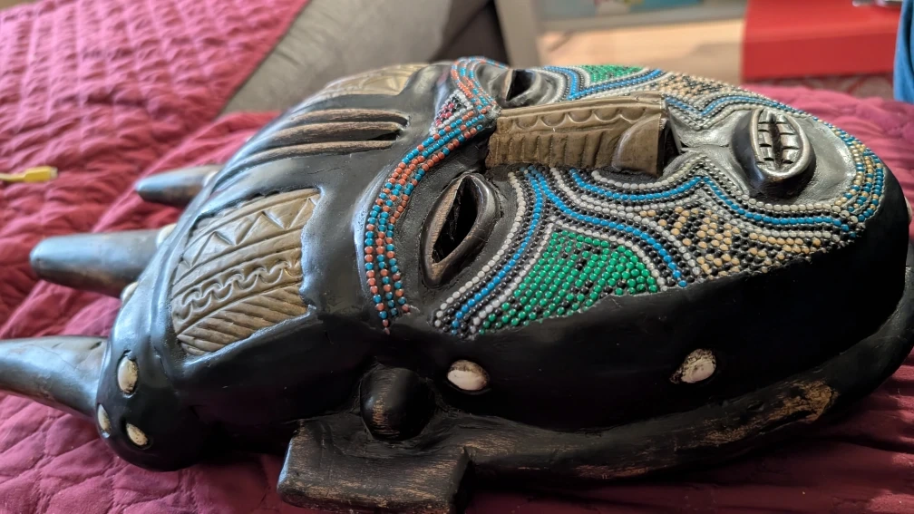 This is an African tribal mask with beaded details and horn-like protrusions. It has a unique and intricate design, perfect for adding an exotic touch to your decor