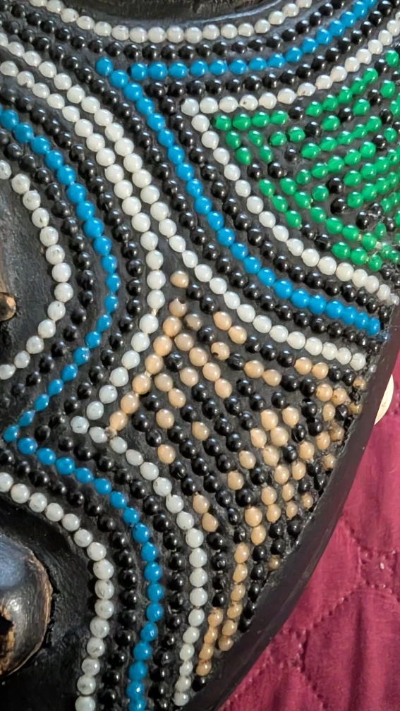 This is an African tribal mask with beaded details and horn-like protrusions. It has a unique and intricate design, perfect for adding an exotic touch to your decor