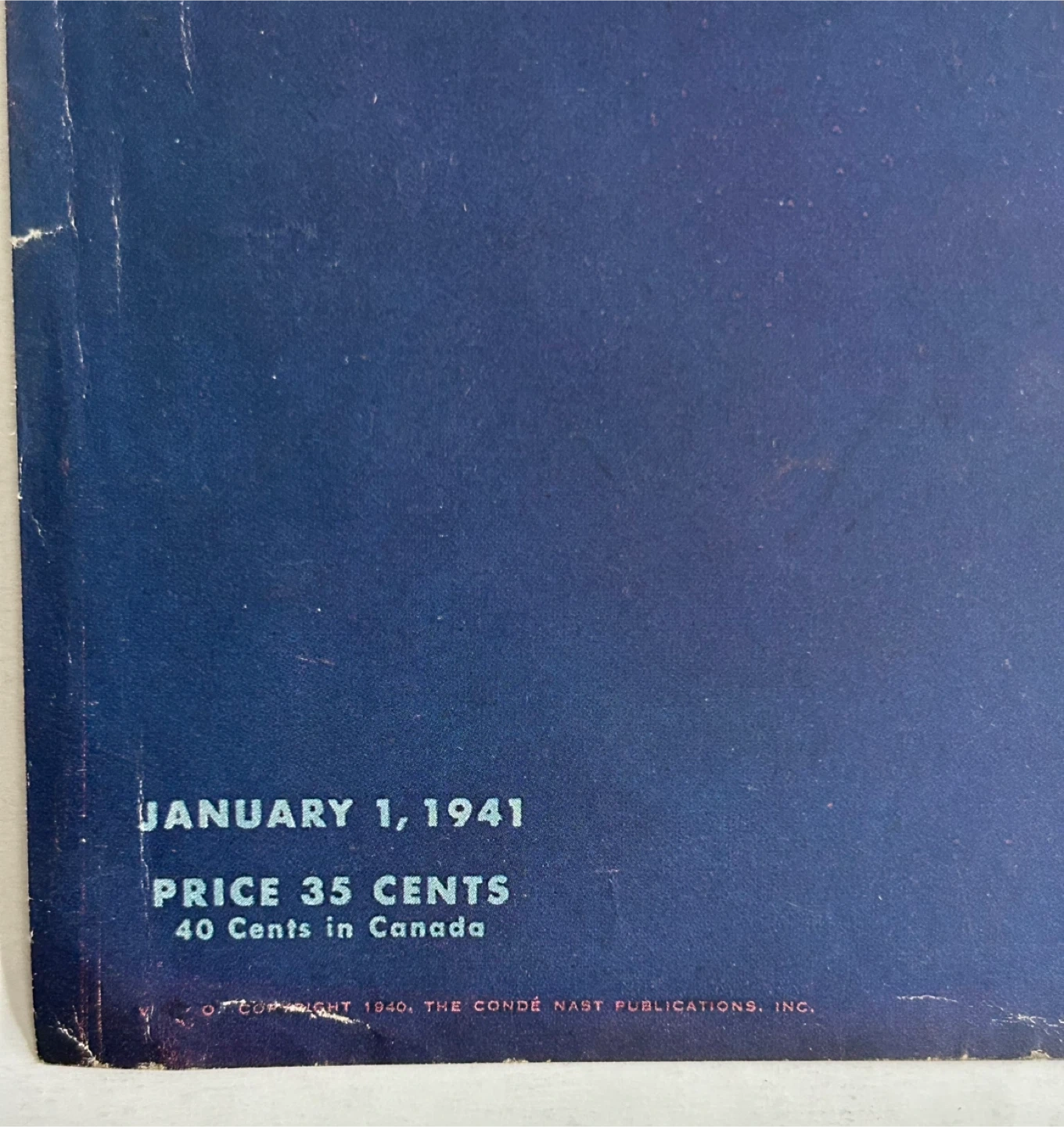 This image displays the January 1, 1941, issue of Vogue magazine, featuring a prominent skiing theme.