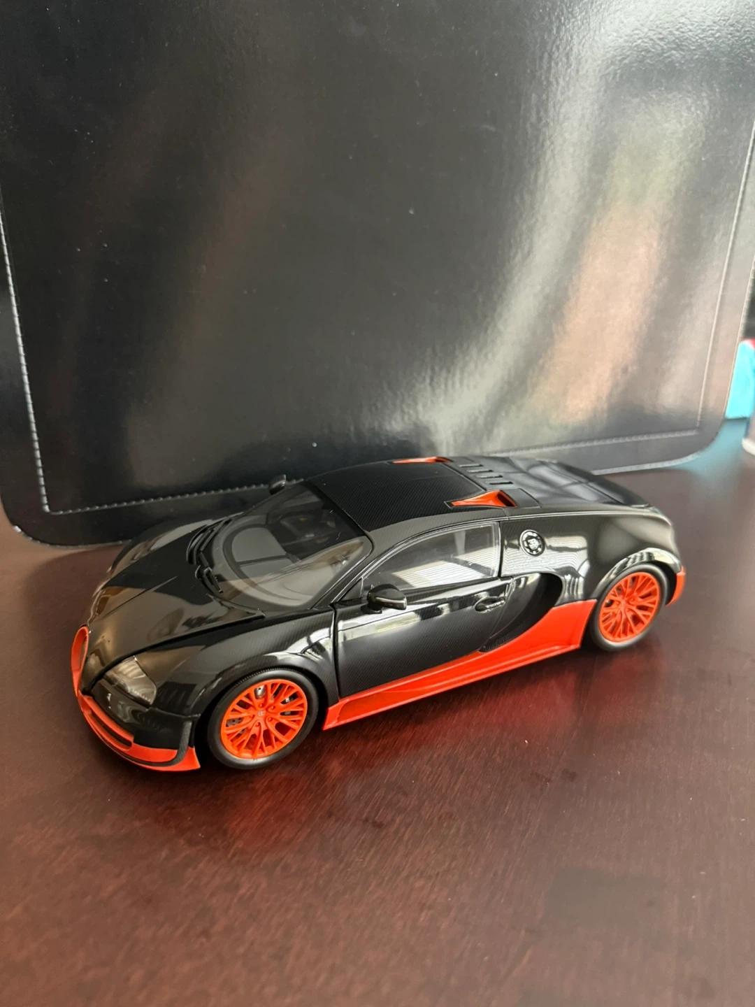 Very rare /1000 pcs Bugatti Veyron grand sport 1:18 minichamps model. Comes with box and top gear racing figure. Excellent condition, only on display in glass case. Minor signs of wear and glue residue under mirror, but a true collectors piece.