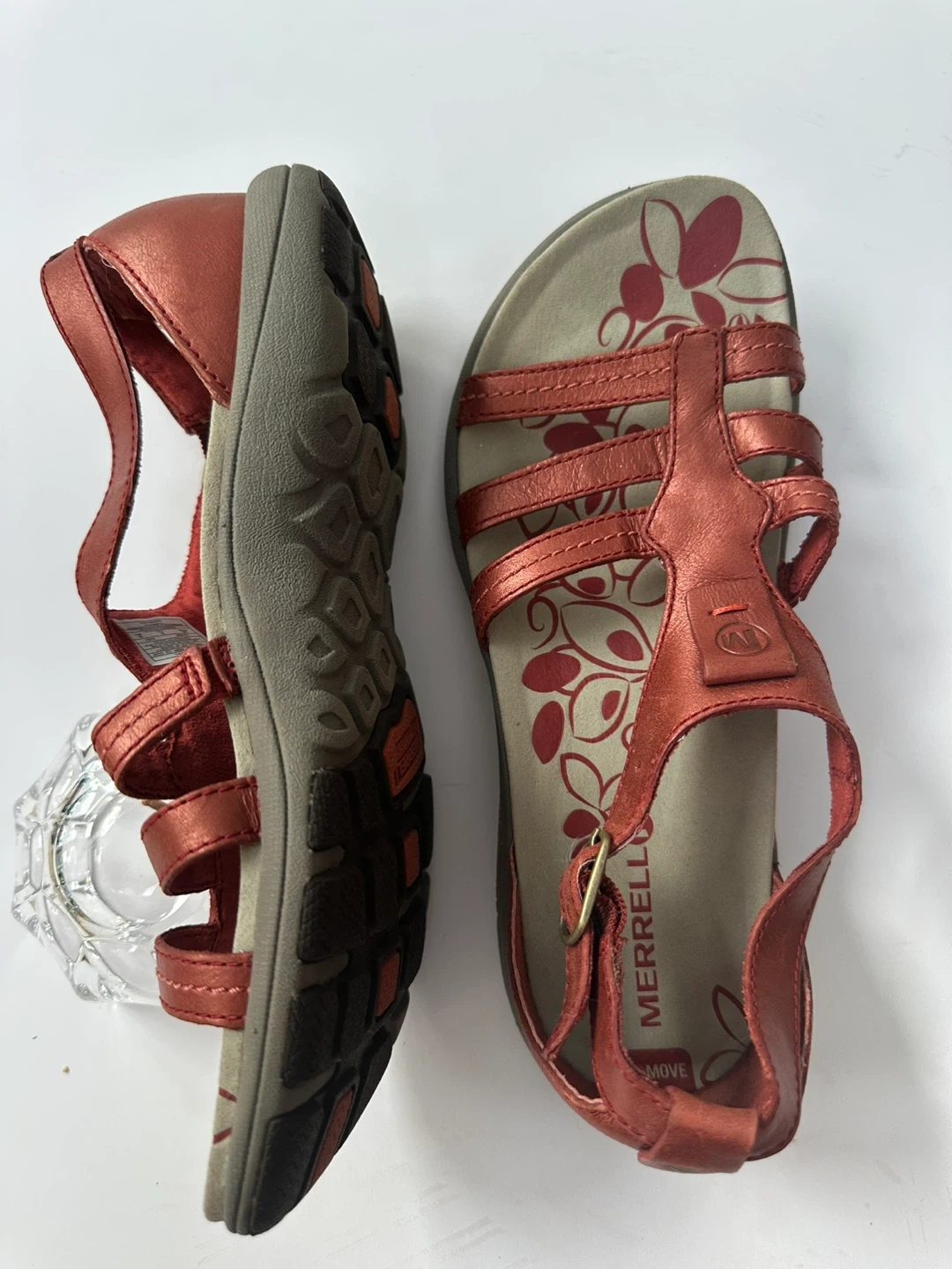 These Merrell sandals are a lovely red metallic colour with floral accents on the insole. They have a comfortable, strappy design with adjustable buckles. Great for warm weather outings!