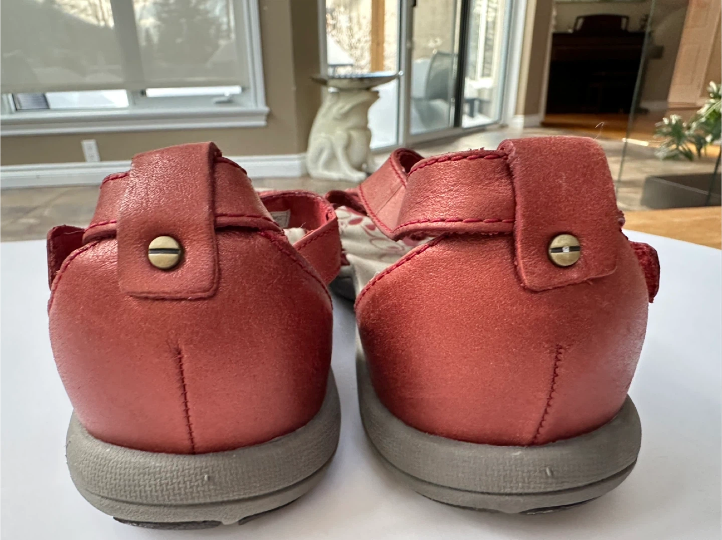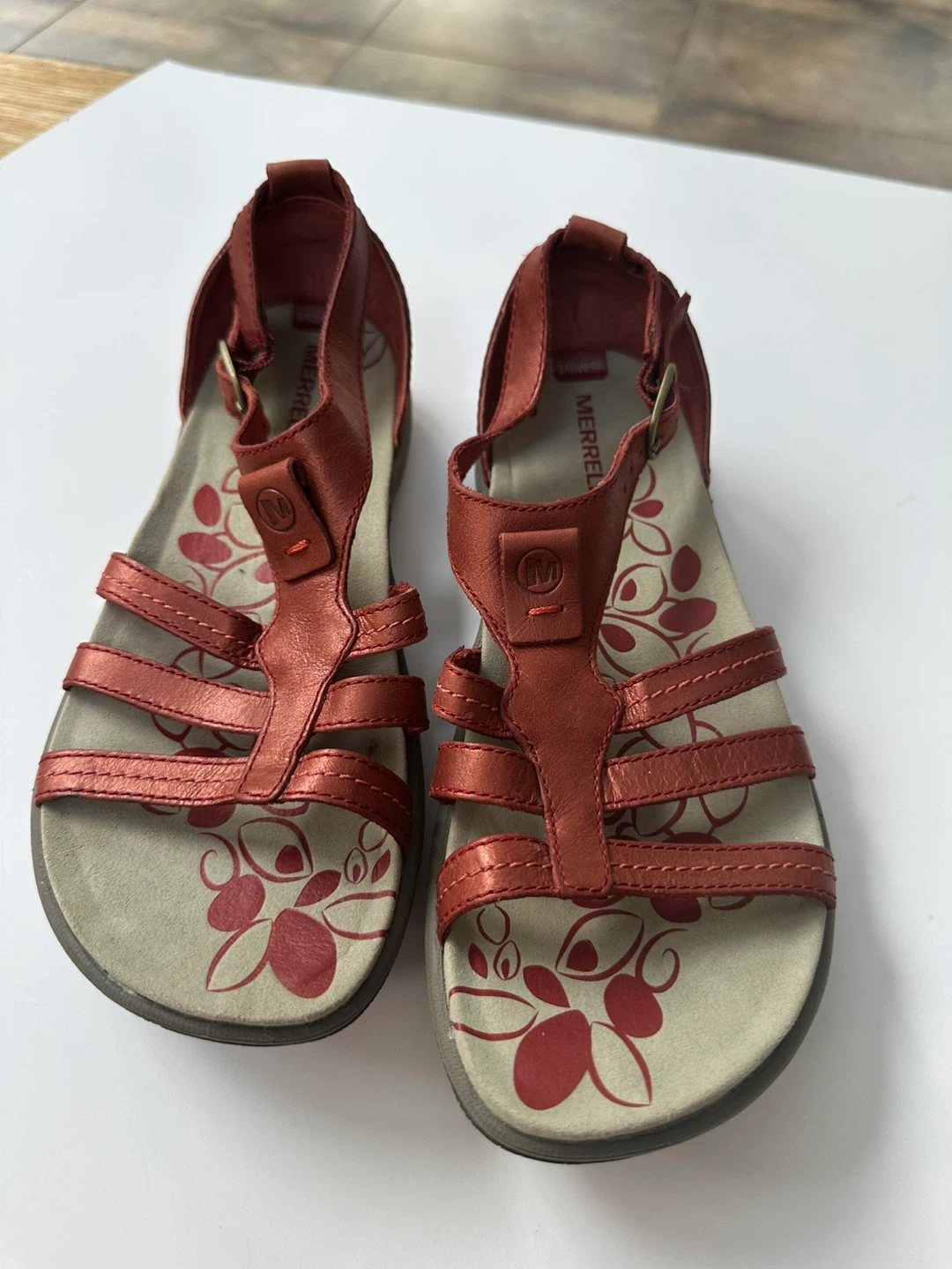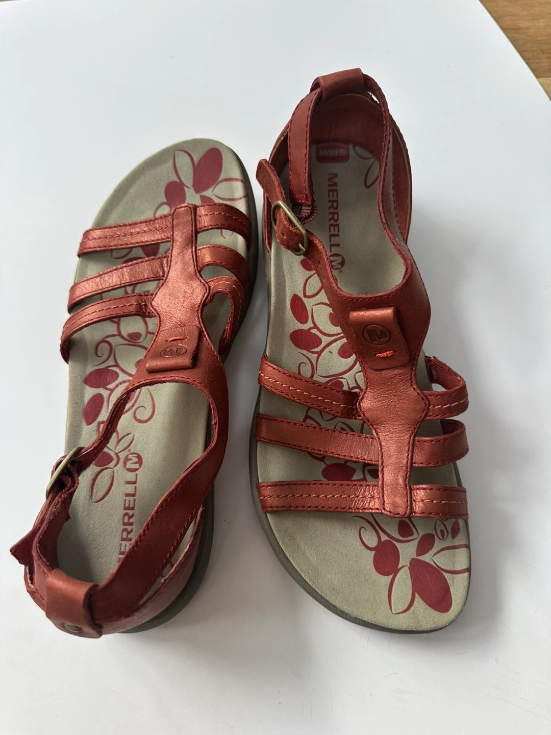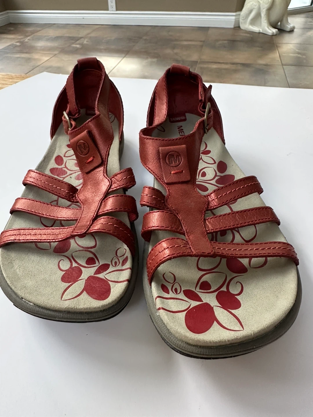 These Merrell sandals are a lovely red metallic colour with floral accents on the insole. They have a comfortable, strappy design with adjustable buckles. Great for warm weather outings!