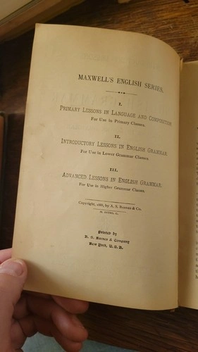 Introductory Lessons in English Grammar (Maxwell's English Series) by W.H. Maxwell, published in 1888 by American Book Company (printed by A.S. Barnes & Co.). This copy features a hand-inked inscription on the front endpaper: "William Jones, Esq. Chief Editor N.Y. Sun, 170 Nassau St.". The New York Sun was a major daily newspaper during the late 19th century. The inscription suggests this was a personal or professional copy belonging to the editor-in-chief. Original burgundy cloth boards with black stamped floral decorative elements show shelf wear, rubbing at the corners, and minor staining. The binding is intact. Pages show expected age-toning but remain clean and legible. The primary value lies in the crisp, legible inscription on the flyleaf.