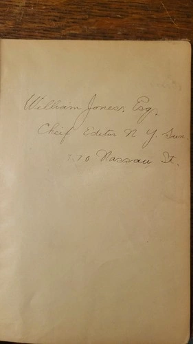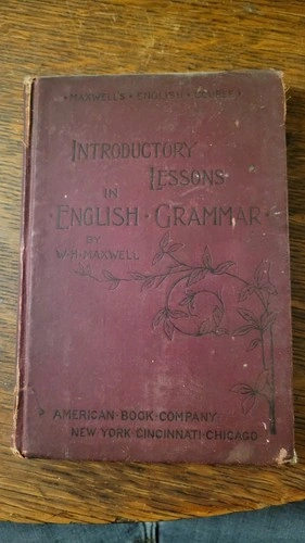 Introductory Lessons in English Grammar (Maxwell's English Series) by W.H. Maxwell, published in 1888 by American Book Company (printed by A.S. Barnes & Co.). This copy features a hand-inked inscription on the front endpaper: "William Jones, Esq. Chief Editor N.Y. Sun, 170 Nassau St.". The New York Sun was a major daily newspaper during the late 19th century. The inscription suggests this was a personal or professional copy belonging to the editor-in-chief. Original burgundy cloth boards with black stamped floral decorative elements show shelf wear, rubbing at the corners, and minor staining. The binding is intact. Pages show expected age-toning but remain clean and legible. The primary value lies in the crisp, legible inscription on the flyleaf.