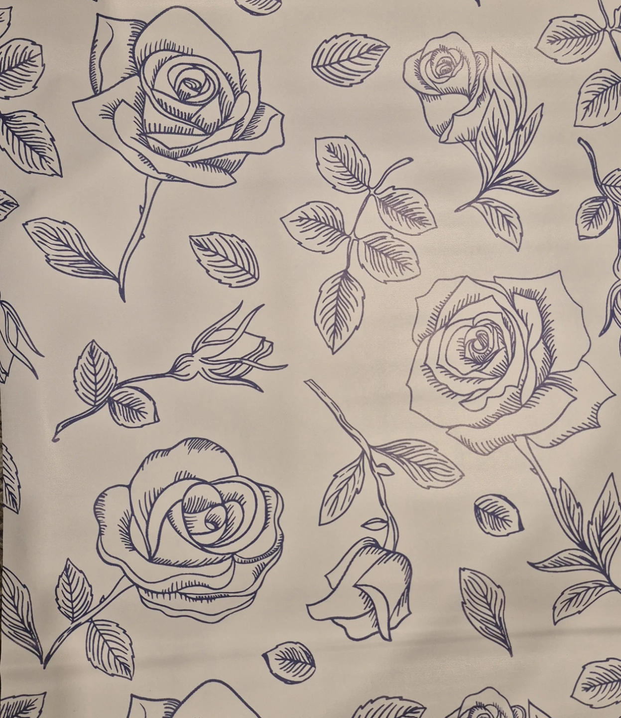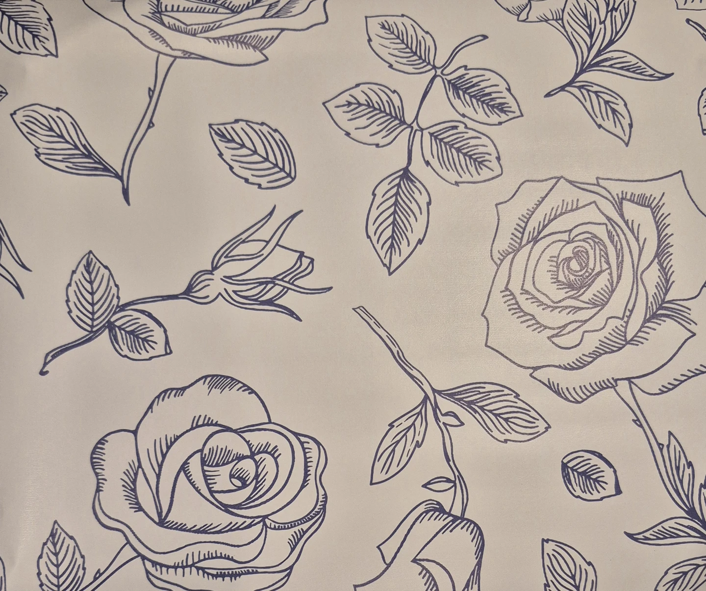 Lovely floral design! New. The pattern features sketched roses and leaves in a blue ink style on a light background. Perfect for adding a touch of nature to any room in your home. 17"×78.7" . Have multiple rolls available.