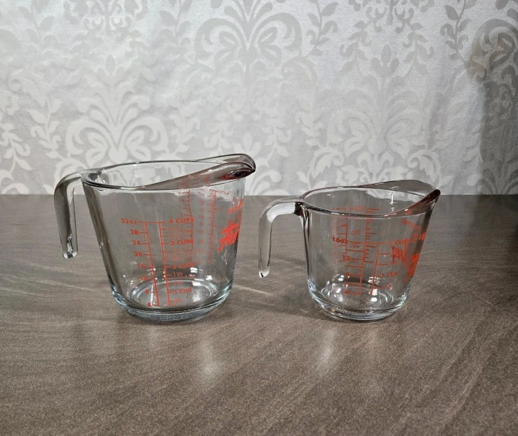Excellent condition. 2 piece Anchor Hocking glass measuring cup set in 2 cup and 4 cup. They are clear glass with red measurement markings. Perfect for any home baker. Cross-posted.