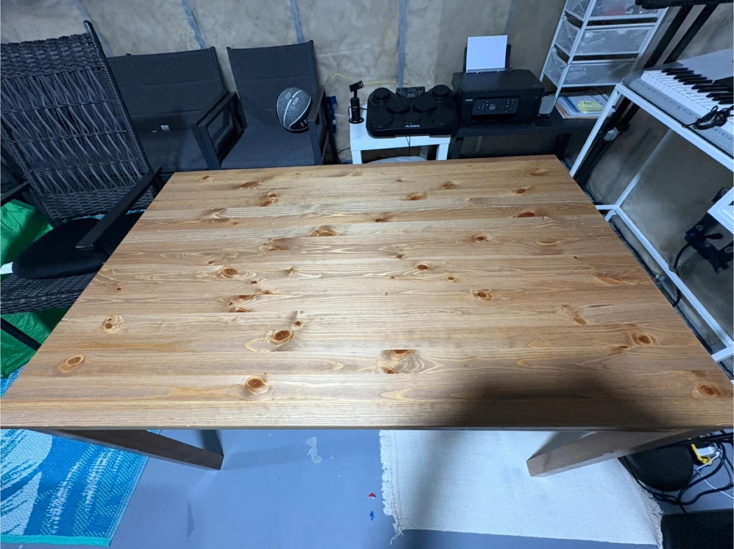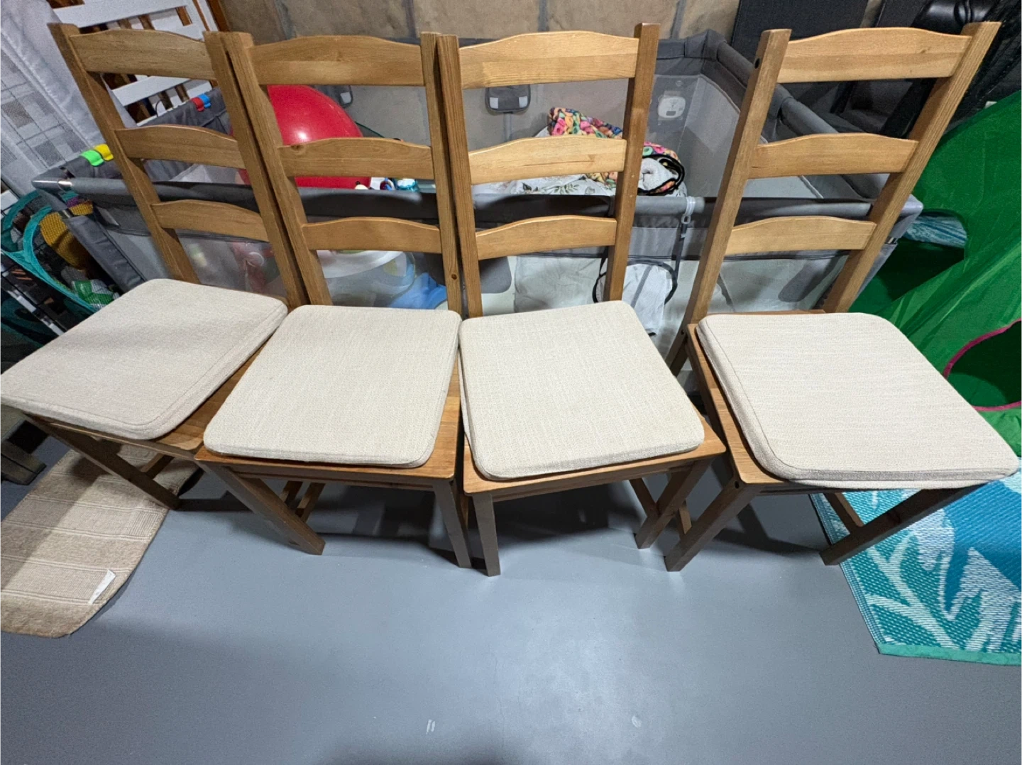 Selling a wooden dining table along with four matching chairs. The set is in good condition and would be perfect for a kitchen or dining area. The chairs have cushioned seats for extra comfort. A great set for family meals or entertaining guests!