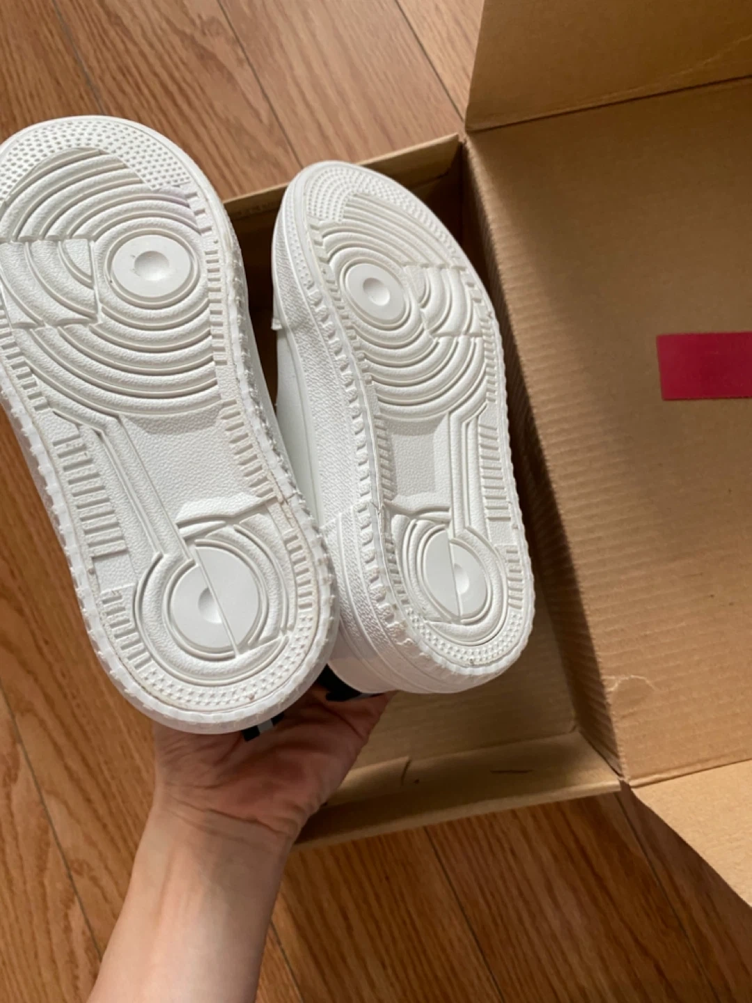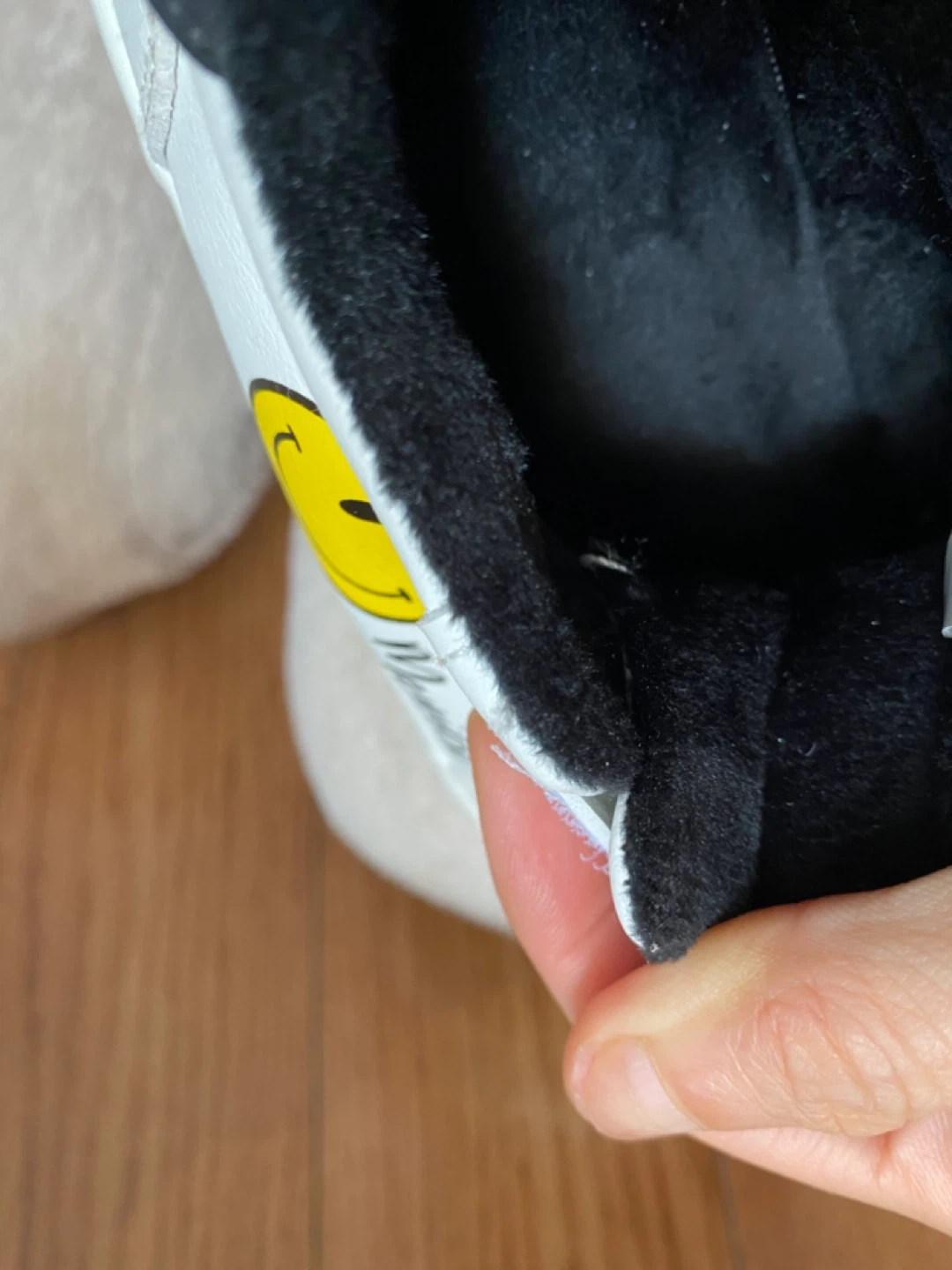 Selling a pair of high quality sneakers in white, perfect for kids! They're a size 11 and come with black laces. The shoes feature a cute smiley face design. The box is included!