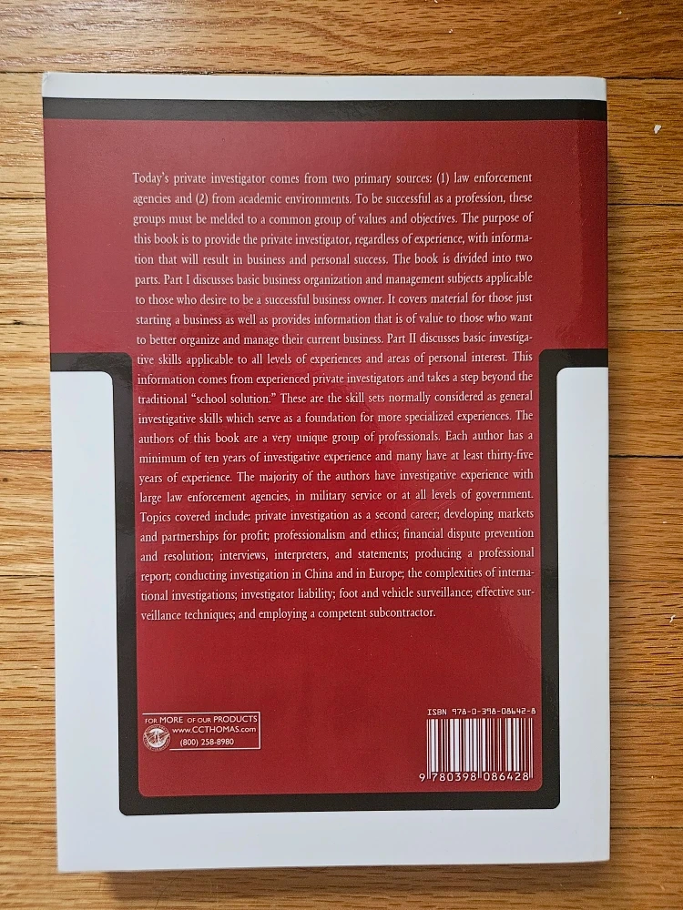 Selling a copy of 'Basic Private Investigation: A Guide to Business Organization, Management, and Basic Investigative Skills for the Private Investigator' by William F. Blake. This book provides information that comes from experienced private investigators and takes a step beyond the traditional "school solution."