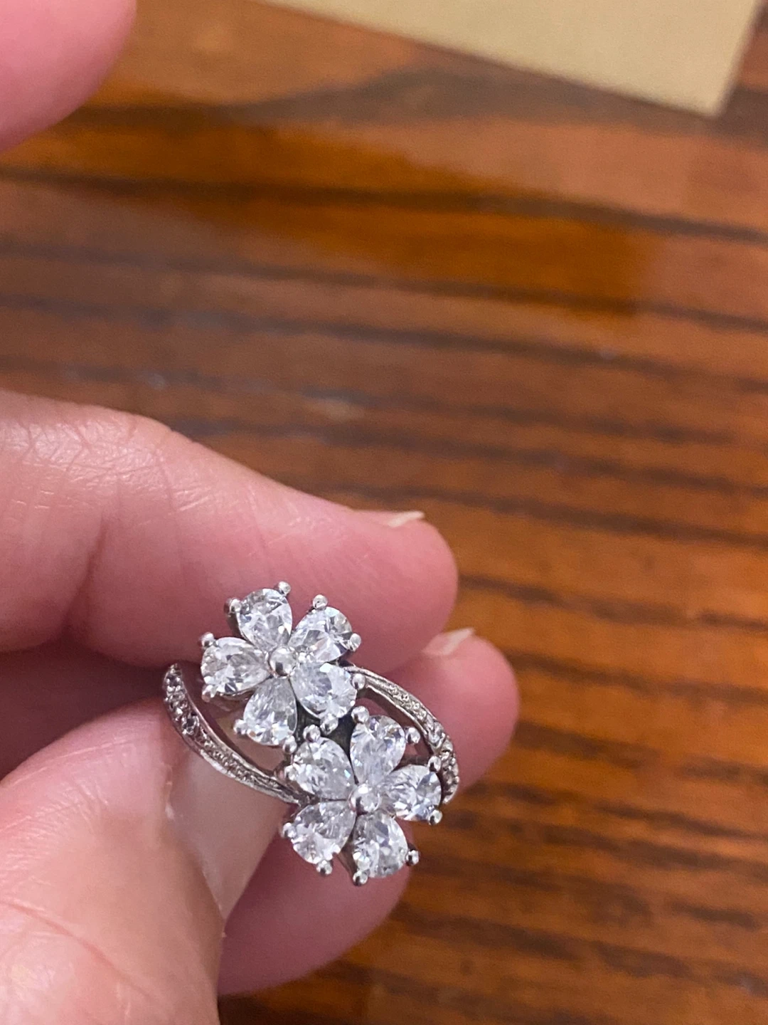 Selling a ring with a floral design. It features two flower-shaped clusters of clear stones, and additional stones along the band. It's in good condition and would make a lovely addition to any jewelry collection