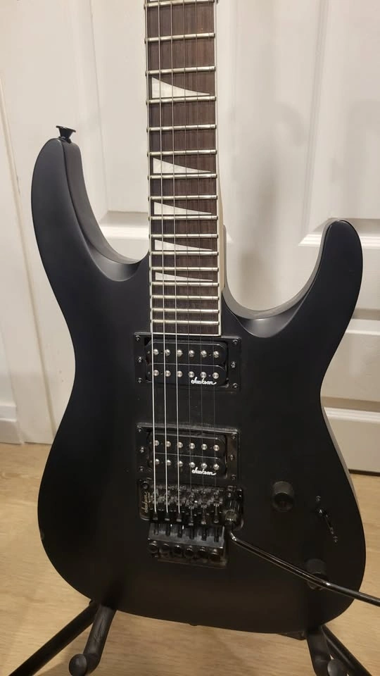 Jackson JS32 DKA in Satin Black with a poplar body, maple neck, and amaranth fingerboard. It has two Jackson high-output humbuckers and a 3-way pickup switch. Fast and sharp-looking, great for heavy riffs and lead playing.