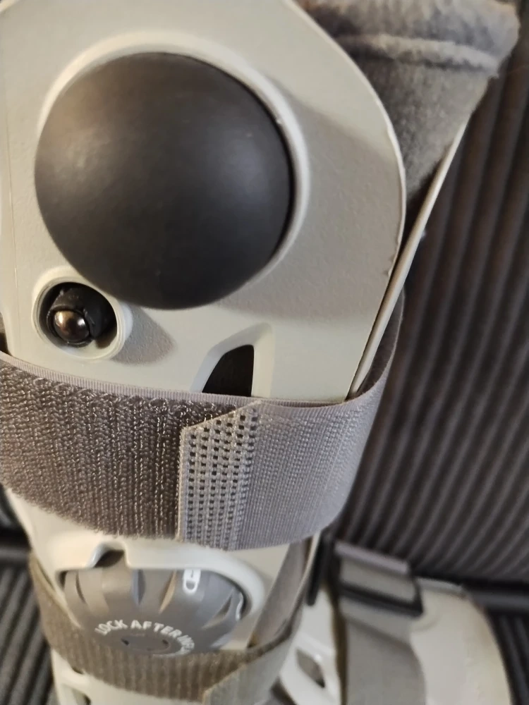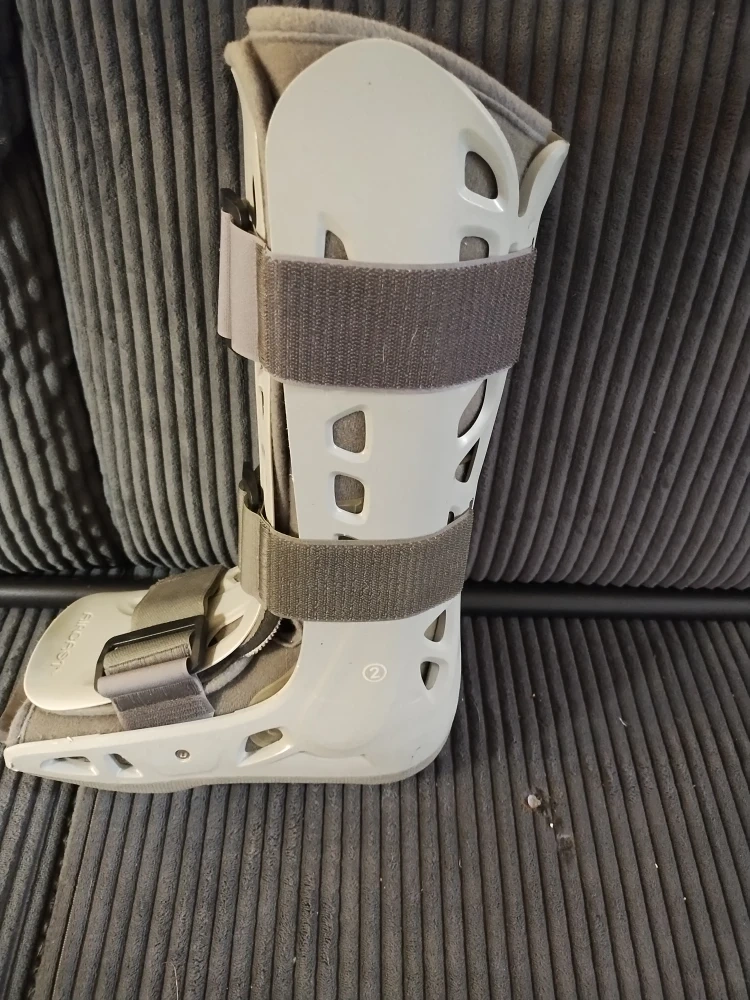 Selling a DJO AirCast walker boot in size small. It features adjustable straps and an inflation mechanism for a comfortable and secure fit. Perfect for recovery! This is an air cast air select, with a low rocker base, so you don't need to wear some higher shoe or an even up on the other foot.