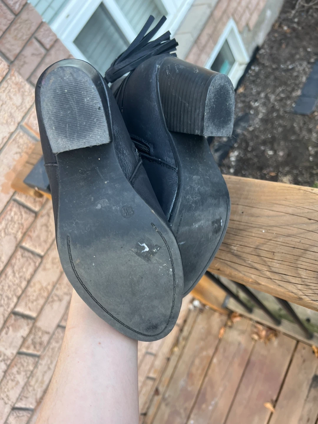 Selling a pair of black wide calf boots in size 8. They have a stylish design with a zipper and tassel detail.