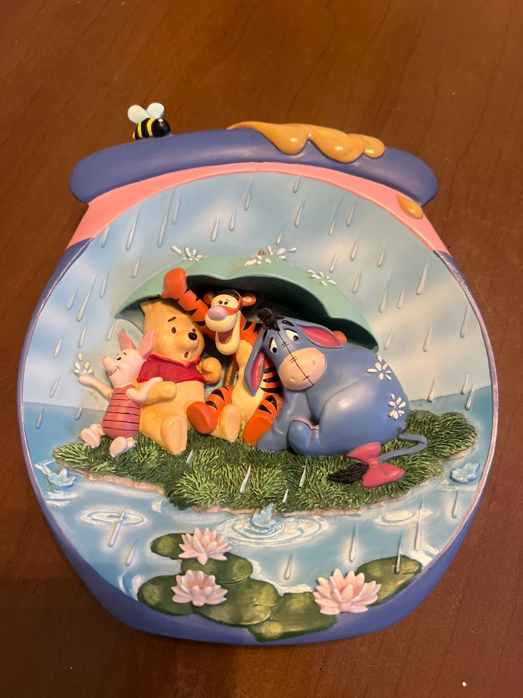 This is a Bradford Exchange collector plate from the Pooh's Humypot Adventures series. It's the first issue in the collection, titled "It's Just a Small Piece of Weather". The plate features Winnie the Pooh, Tigger, and Eeyore under an umbrella in a rain scene. It's a limited edition, and the back of the plate is marked with the Bradford Exchange number 84-B10-485.1