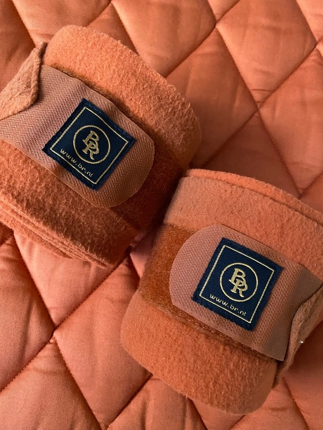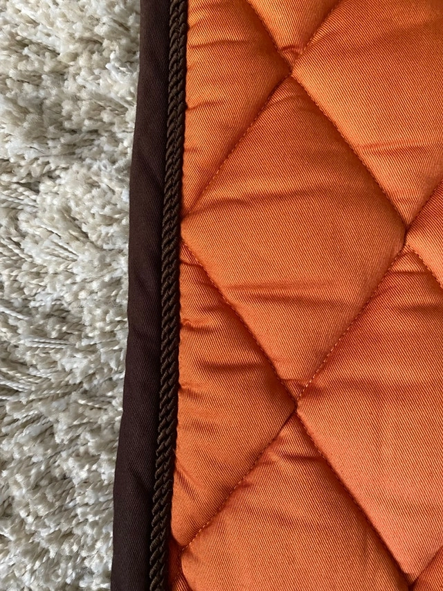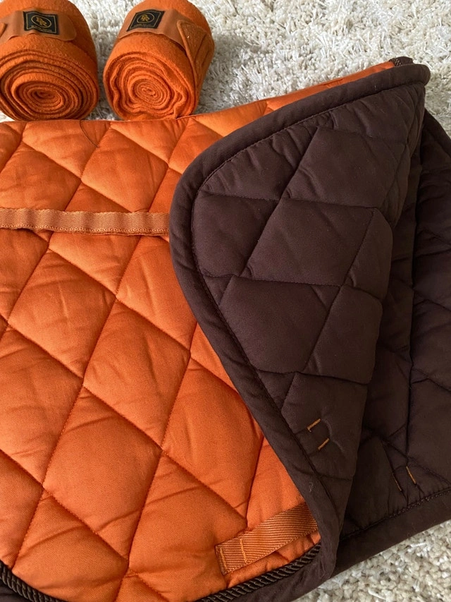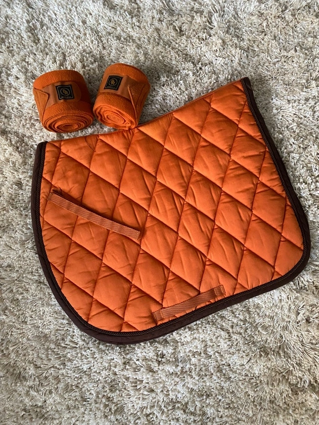 Selling a BR Equestrian orange saddle pad with brown trim. Comes with 4 matching polo wraps. Size: Full (horse) Jump cut. Please contact if interested. Cash accepted. Curbside pick up
