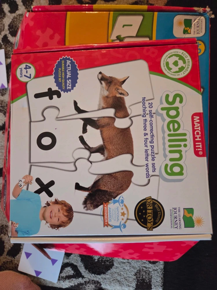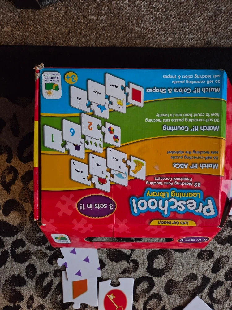 Selling Preschool Learning Library Puzzles! This set includes three different Match It! puzzles: Colors & Shapes, Counting, and ABCs. It also has a Spelling puzzle. Recommended for ages 3-7 years
