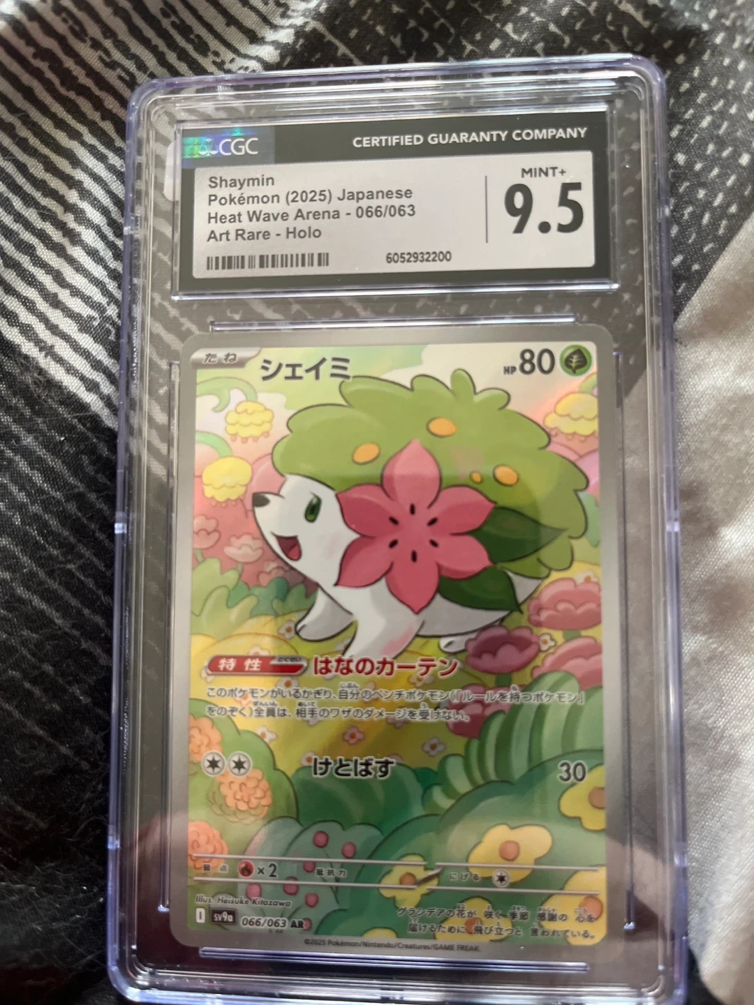 Selling a Shaymin Pokemon card, graded 9.5 by CGC (Certified Guaranty Company)! This is the Heat Wave Arena 066/063 Art Rare Holo version. A great addition to any collection!