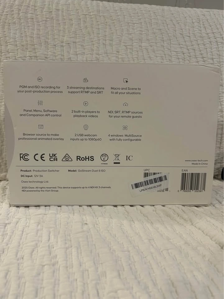 Brand New Osee GoStream Duet 8 ISO Video Mixer Switcher - 8 Channels. 8 Flexible Sources. 3 Outputs. 9 Video Layouts. XLR and 3.5 Audio. PGM AND ISO and ISO recording for your post production process. 3 streaming destinations support RTMP and SRT. Macro and Scene to fit all situations. Panel , Menu, Software and Companion API Control. 2 built - in players to playback videos. NDI, SRT, RTMP sources for your remote guests. Browser source to make professional animated overlay. 2 USB webcam inputs up to 1080 p60. 4 Windows Multisource with fully configurable. $800 Cash or Best Offer.
