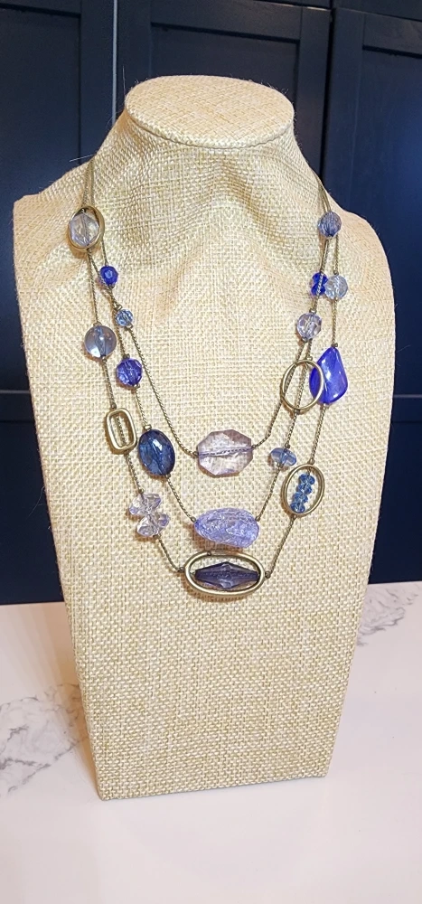 Beautiful multi-layered necklace featuring mixed blue and clear beads, faceted acrylic stones, and antique-gold tone oval accents. Lightweight, eye-catching, and perfect for adding a pop of colour to any outfit.