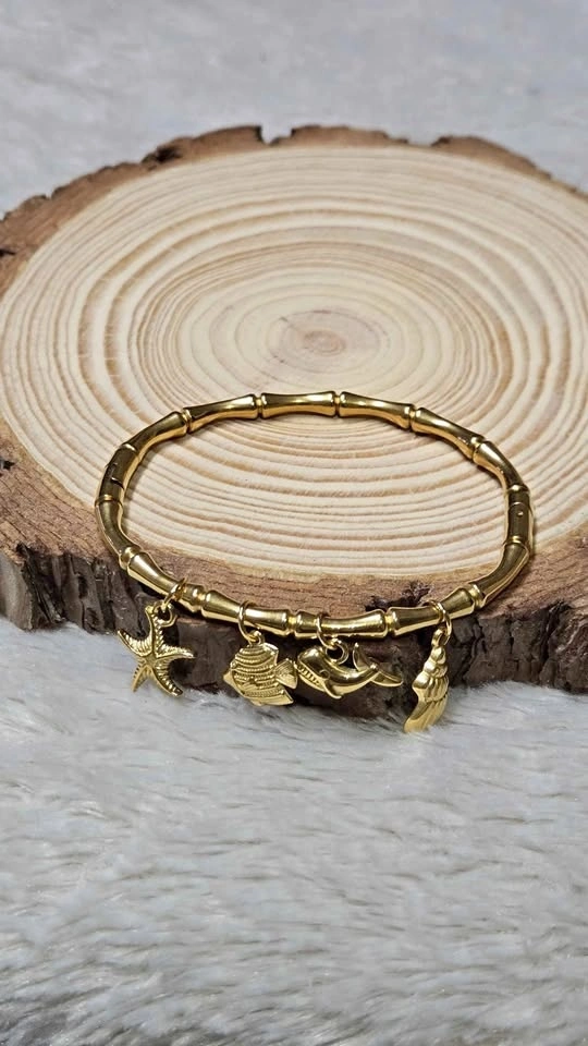 Stainless Steel gold plated bamboo design bangle with "sea creature" charms.