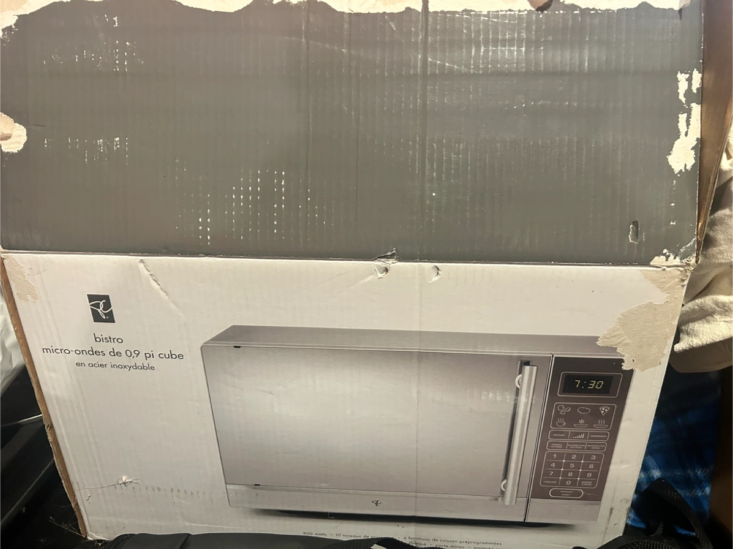 Selling a Bistro microwave with a 0.9 cu ft capacity. It's made of stainless steel and has 900 watts of power. It features 10 power levels and pre-programmed cooking functions. Box included!