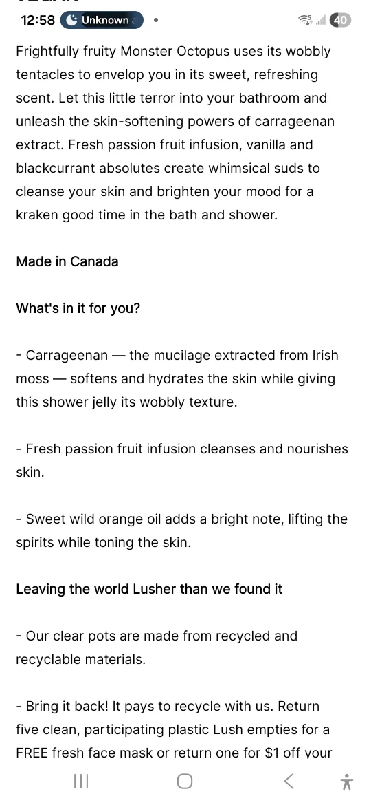 Selling a Lush Monster Octopus shower jelly! It's a frightfully fruity shower jelly that uses its wobbly tentacles to envelop you in its sweet, refreshing scent. Made in Canada. It's wobbly with a jelly texture!