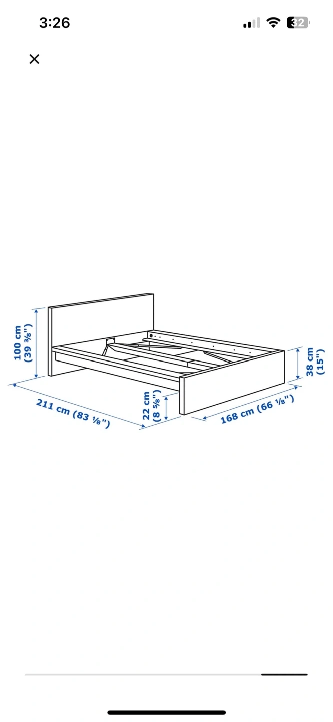 Selling a Malm bed frame from IKEA in brown. It's in great shape and ready for a new home! Dimensions are 211 cm (83 1/8") length, 168 cm (66 1/8") width, and 100 cm (39 3/8") headboard height
