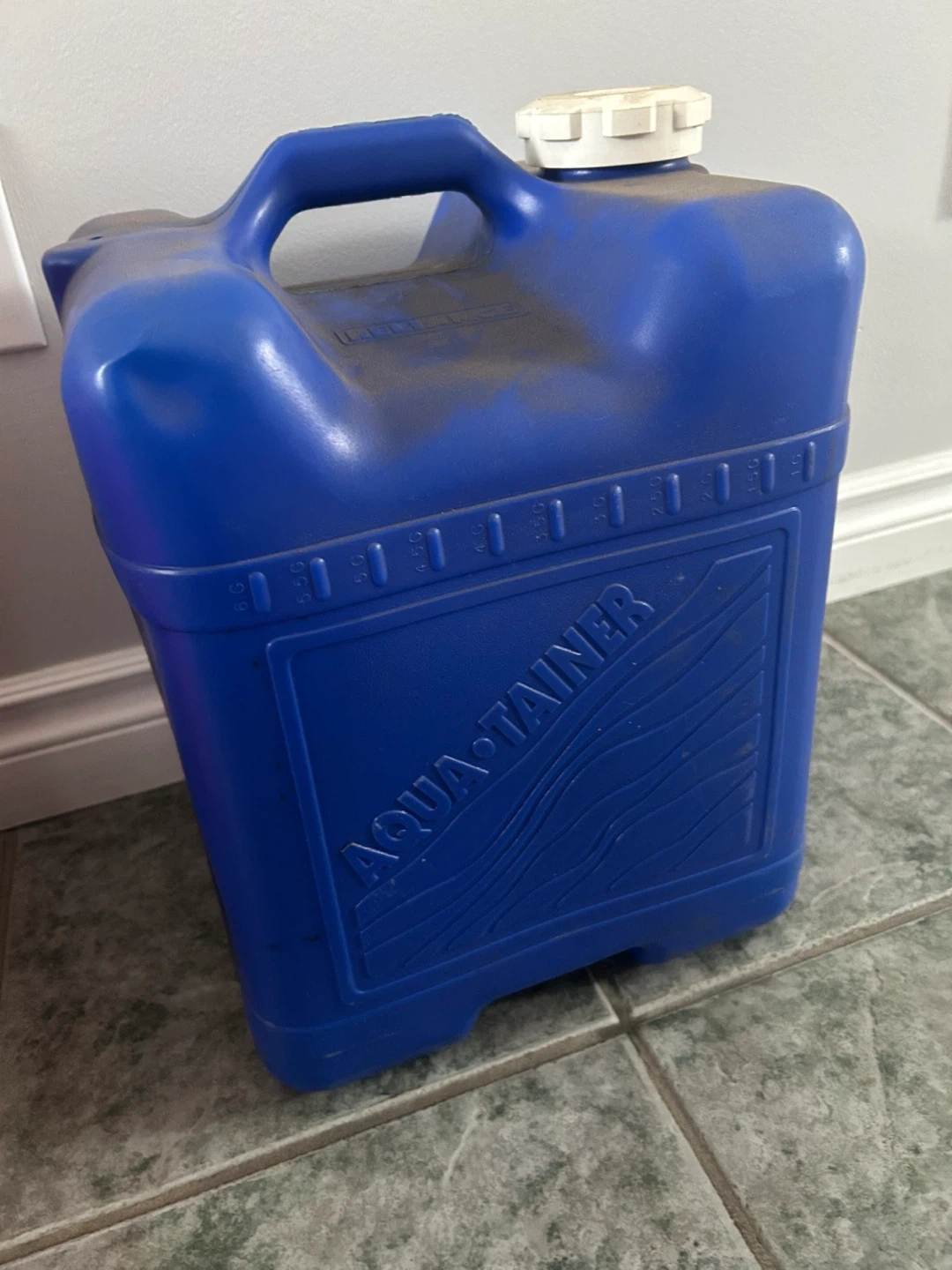 Selling a blue Aqua-Tainer water container. It's in used condition, but still works great for storing water for camping or emergencies. It has a convenient handle for easy carrying