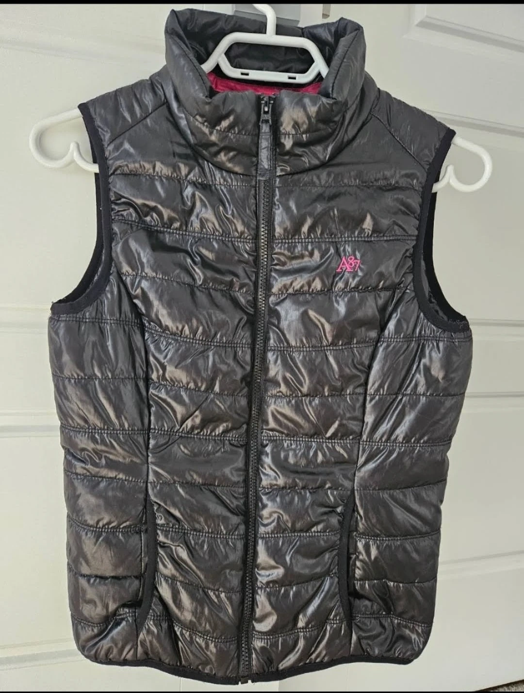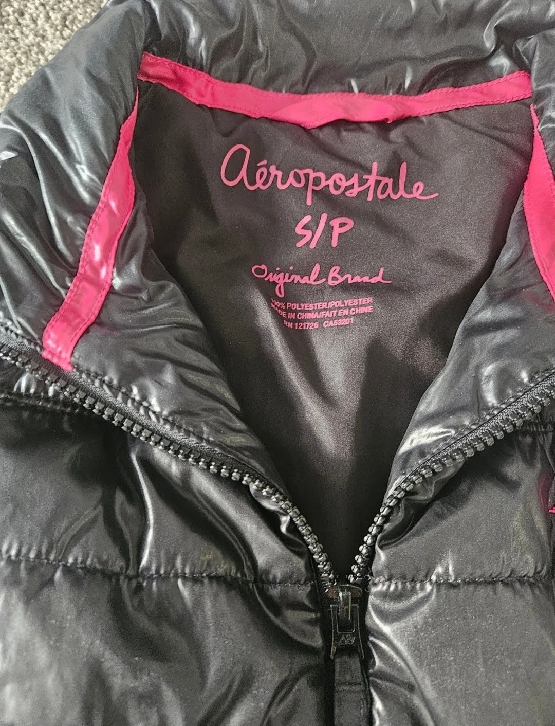 Selling an Aeropostale puffer vest in size small! It's black with a pink lining and logo. Great for layering or wearing on its own during cooler days.