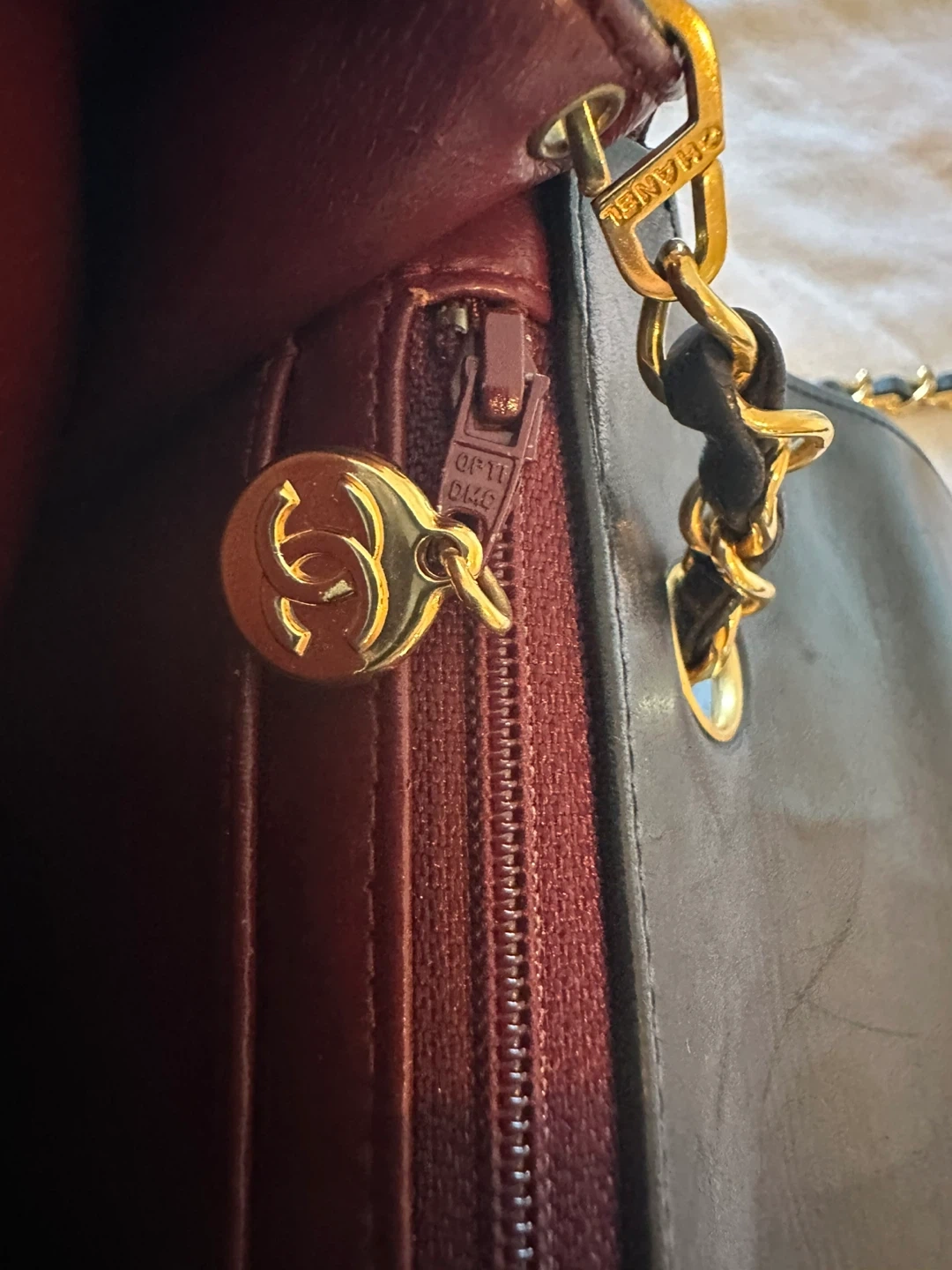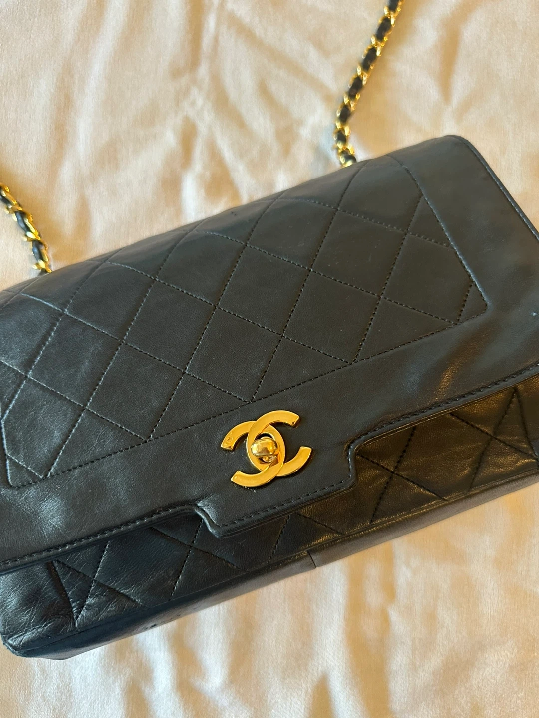 Selling a Vintage Circa 1985-1993 Lambskin Diana Chanel black leather shoulder bag. It features a gold chain and the classic Chanel logo. It's in good condition and perfect for adding a touch of elegance to any outfit! NO box, NO dust bag. Price is Firm. Please ask if you have any questions. 1012585