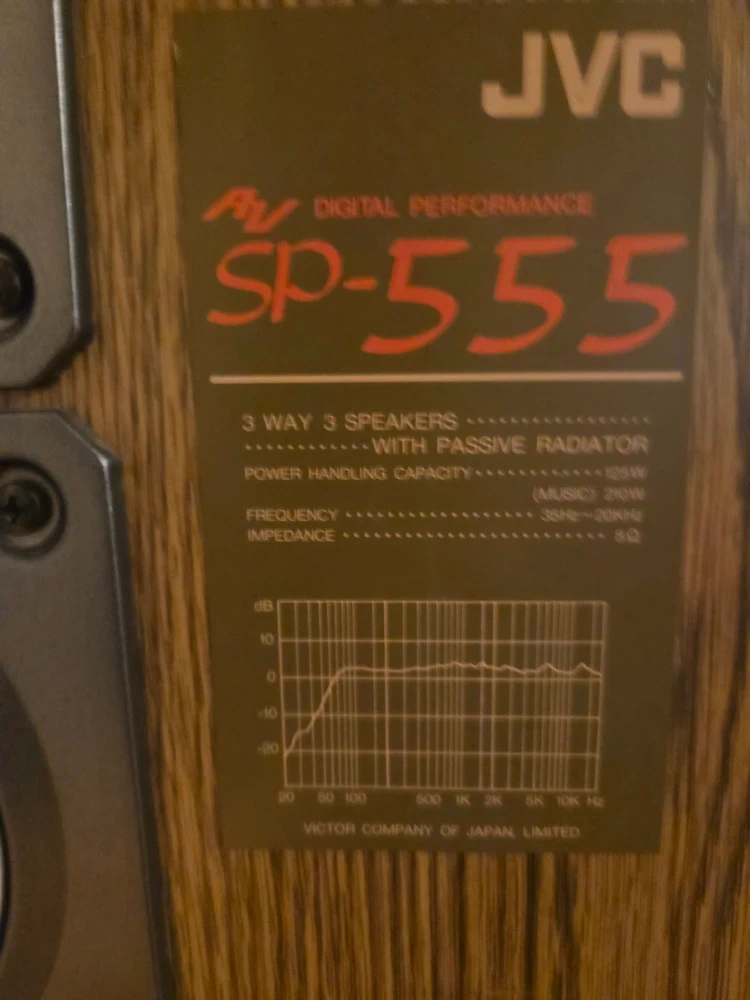 Selling a pair of JVC SP-555 speakers. They are 3-way speakers with passive radiators, offering digital performance. The power handling capacity is 125W (music), and the frequency response ranges from 35Hz to 20kHz. Great for enhancing your audio setup!