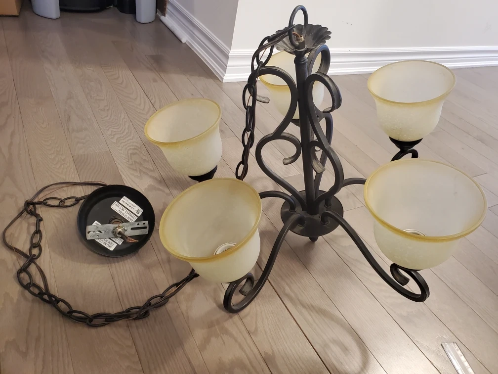 Selling a chandelier with a metal frame and five lights. The shades are a frosted glass. It's in good condition and ready to brighten up your space!