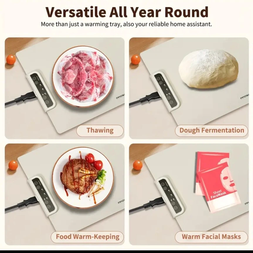Keep your food warm with this electric food warming mat! It heats up quickly in 10 seconds thanks to its upgraded aluminum foil heating plate. It's versatile all year round, not just for warming food, but also for thawing, dough fermentation, and even warming facial masks! It has 3 temperature modes and timer functions. Dimensions are 38cm x 60.8cm.