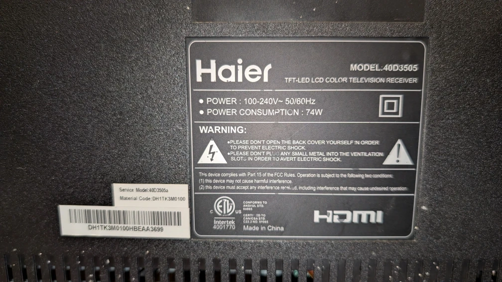 Selling a Haier 40D3505 40-inch LED TV. This light weight, TFT-LED HD colour television receiver has the modern style with a thin bezel framing the picture. It's in great working condition with a bright and clear picture. It has multiple ports including three HDMIs and a USB. It is not a smart TV, and needs to be wall-mounted.
