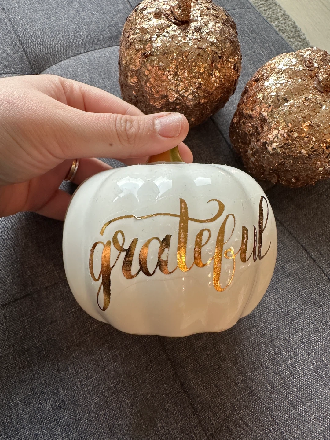 Selling a set of decorative pumpkins! One is white with gold lettering that says 'grateful', and the other two are covered in gold glitter.