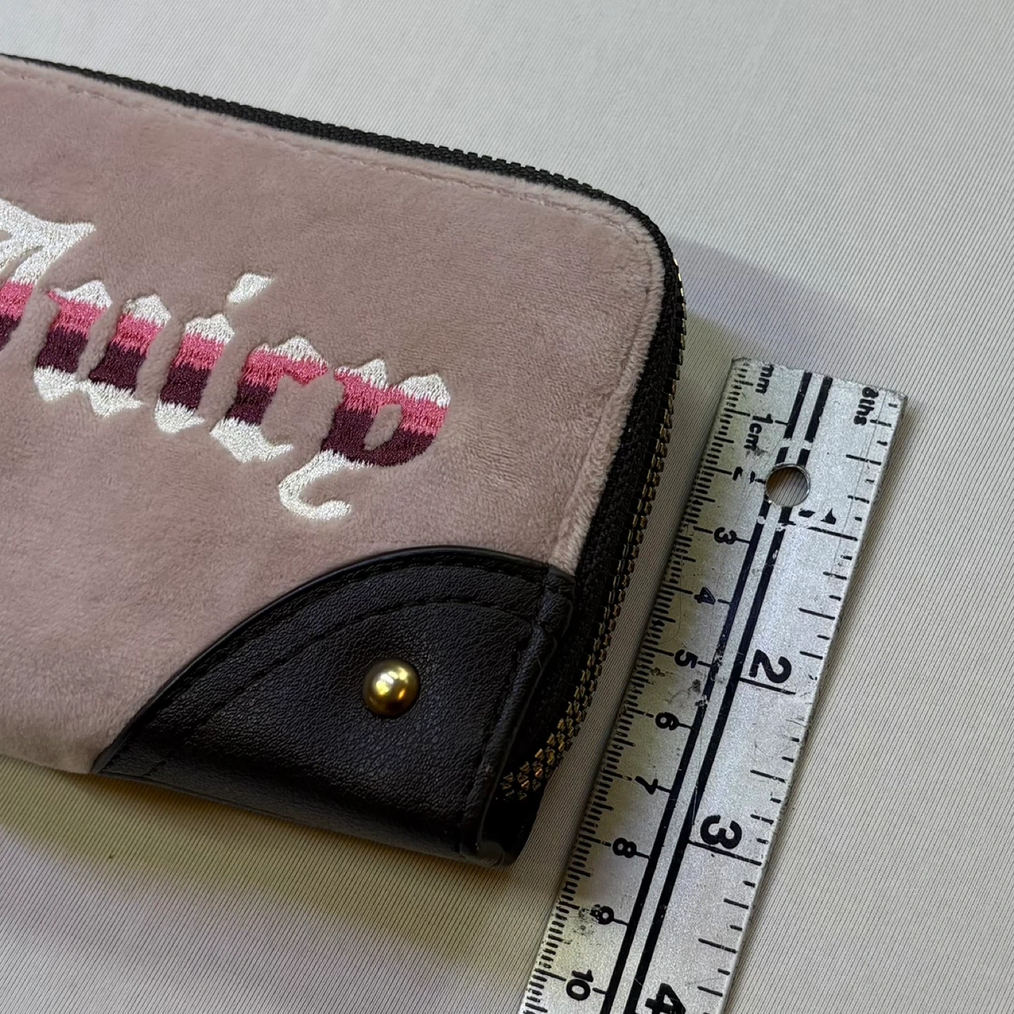 Embrace the Y2K revival with this adorable and practical Juicy Couture compact wallet. Featuring the classic plush velour body in a soft pink/taupe hue, the front is accented with the iconic Juicy logo embroidered in white and pink tones. The bottom corners are finished with rich dark brown faux leather accents and gold-tone studs. This wallet is perfect for those who prefer a minimalist carry, easily fitting into smaller purses or backpacks. The double-zippered design allows for organized storage, ideal for coins, cash, cards, and small essentials. A gold-tone heart charm on the zipper pull adds that signature Juicy charm.