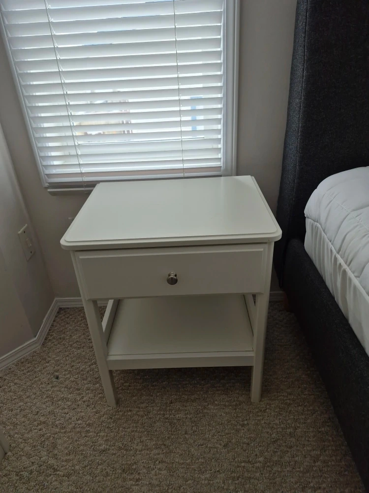 Here's a cute white nightstand that would look great in any bedroom! It has a drawer and a shelf for extra storage. It's in great condition and ready for a new home