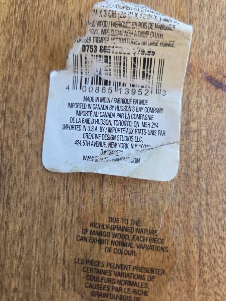 Selling a GlucksteinHome Lucca round board. It's made of mango wood and measures approximately 24 inches in diameter. It's in good condition and ready for a new kitchen!