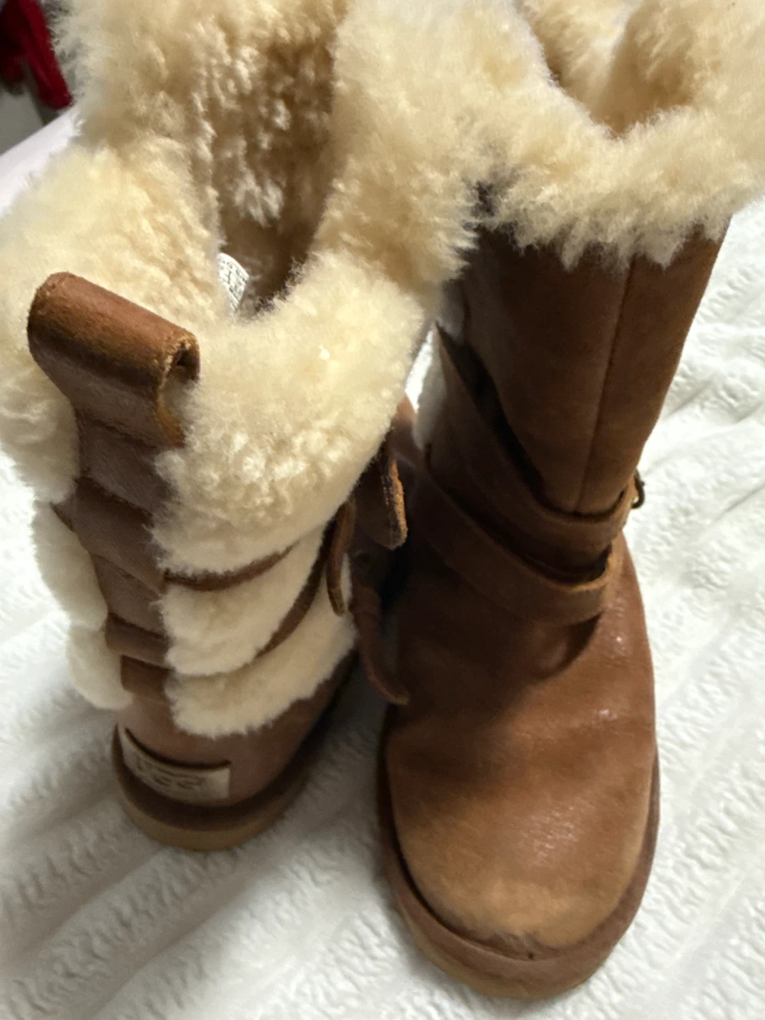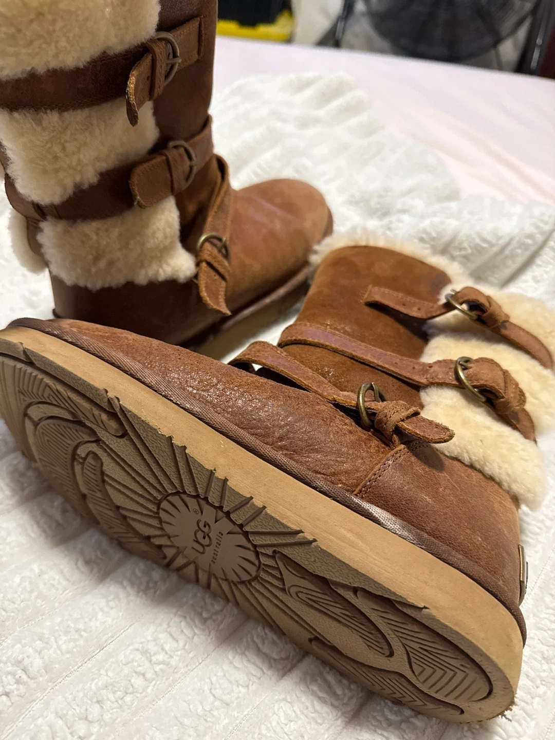 Selling a pair of UGG boots in brown leather. They feature a buckle design and are lined with cozy shearling. Perfect for keeping your feet warm and stylish!