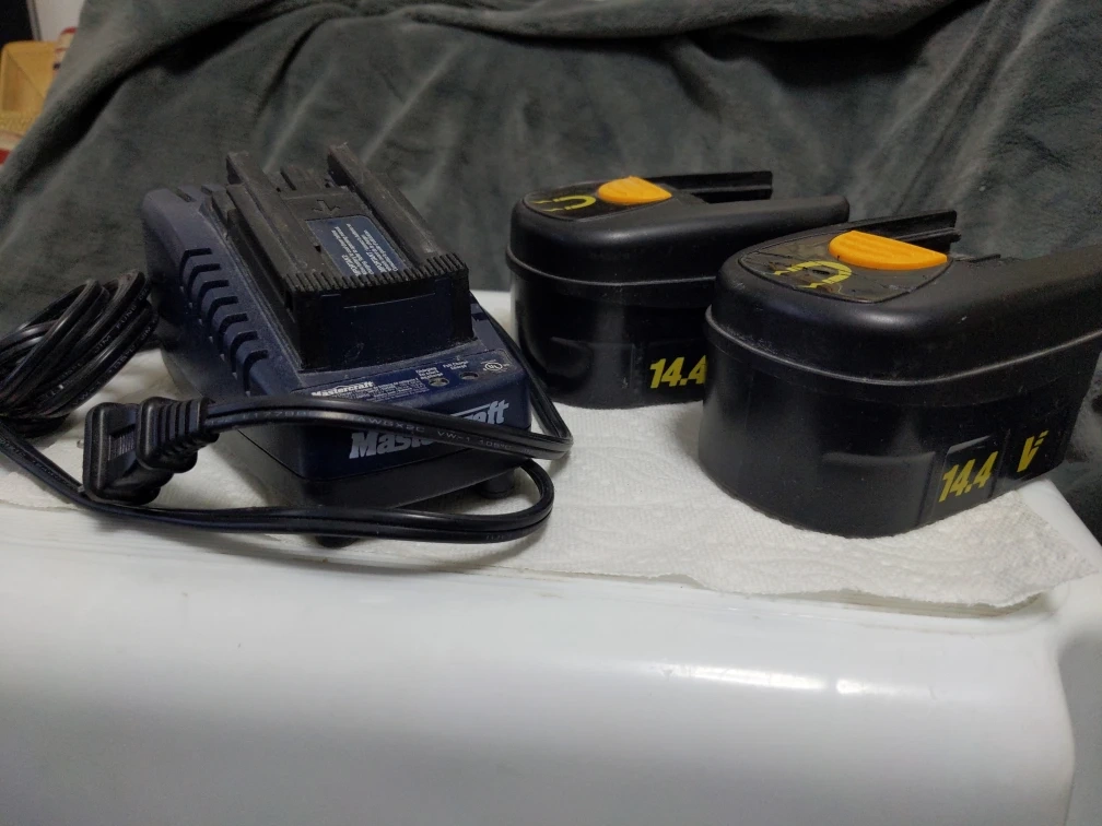 Selling a Mastercraft 14.4V battery charger along with two 14.4V batteries. It appears to be in good condition and ready to use