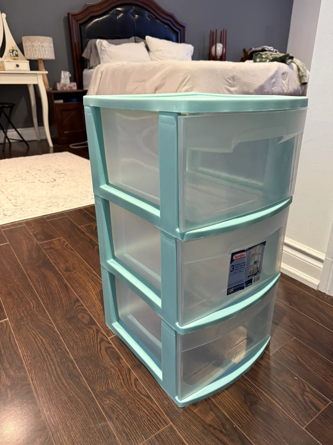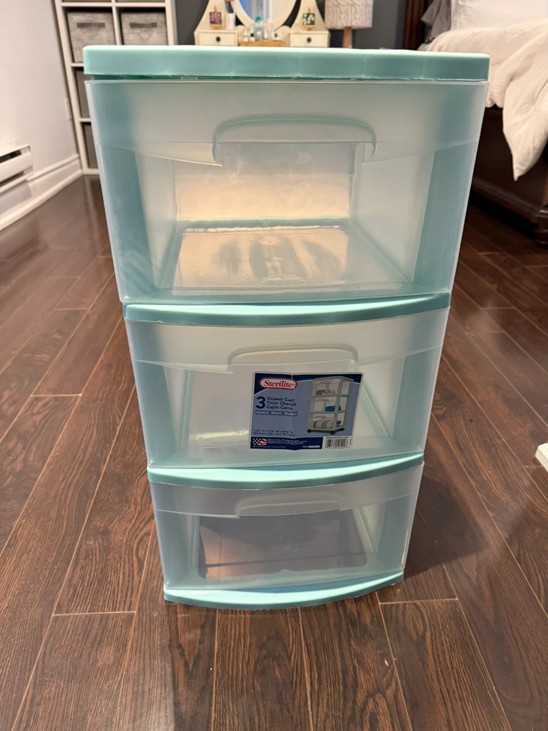Selling a Sterilite 3-Drawer Wide Cart in a refreshing mint colour! It's perfect for organizing your home or office. This cart is in great condition and ready to help you declutter and keep everything tidy